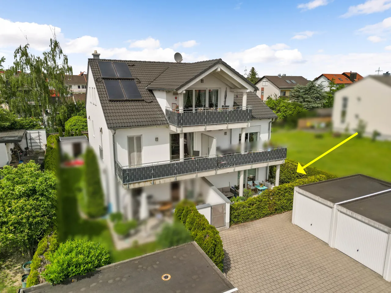 Das Grundstück ist über die Südseite erschlossen. Über den Garagenhof gelangen Sie auf die Gebäuderückseite (Norden). Dort befindet sich der Hauseingang. Alle Wohnungen sind überwiegend in den sonnigen Süden ausgerichtet.