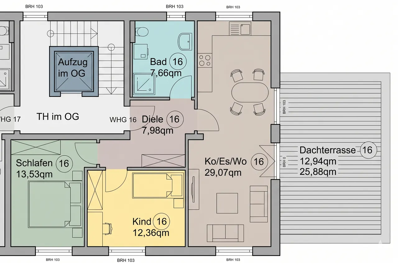 + Personenaufzug je Haus vom Kellergeschoss bis ins Dachgeschoss