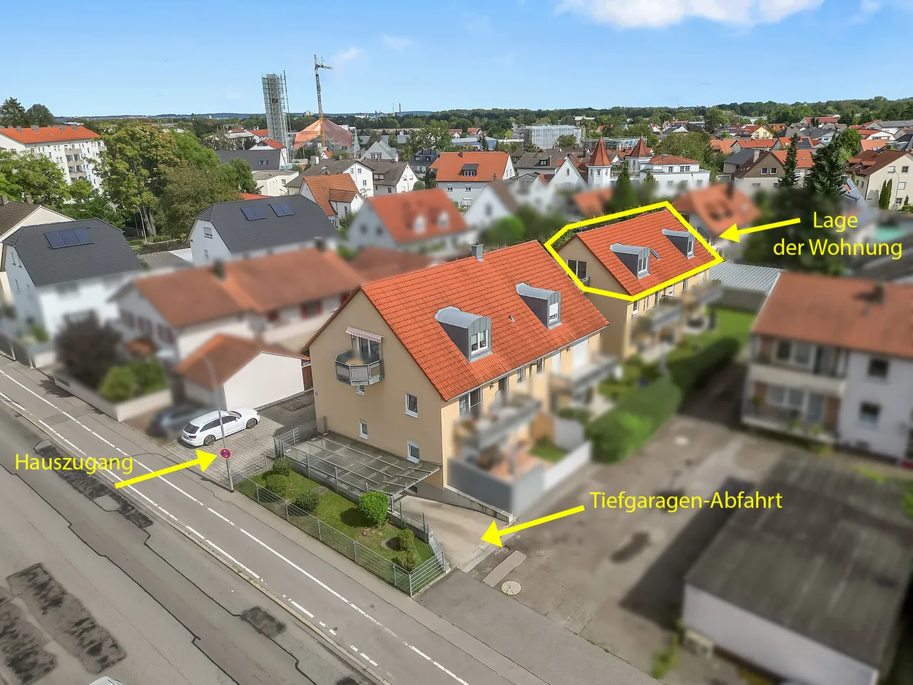 Das Mehrfamilienhaus wurde im Ingolstädter Südosten (Augustinviertel) errichtet. Dank der zentrumsnahen Lage ist auch die Ingolstädter Innenstadt bequem zu erreichen. Innerhalb des Grundstücks befindet sich die Immobilie im hinteren Gebäudekomplex und erstreckt sich über die gesamte Dachgeschoss-Etage.