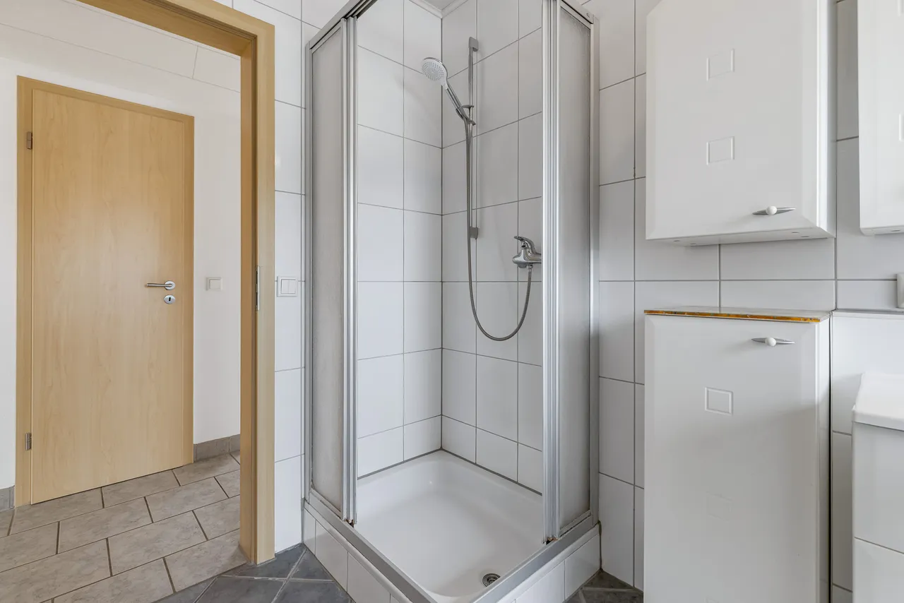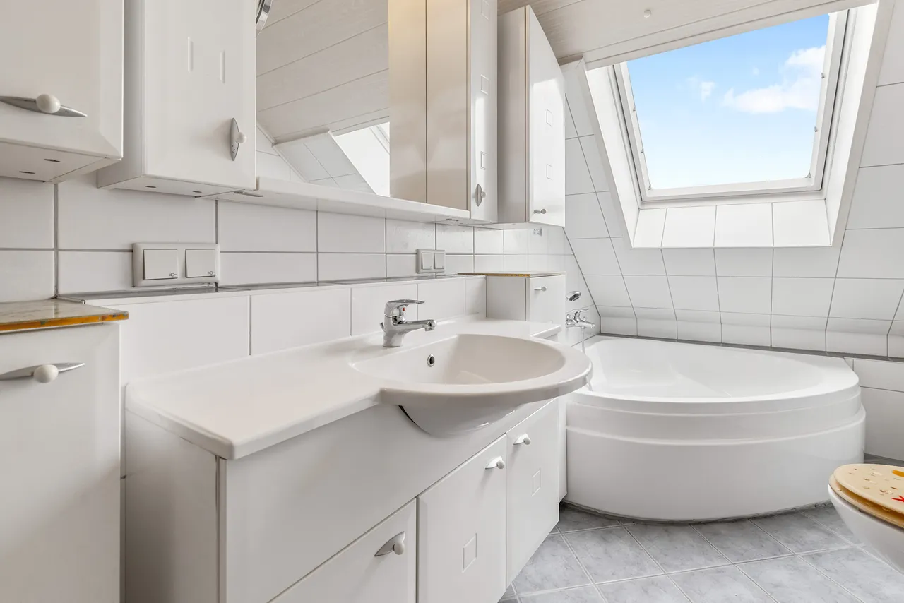 Im Badezimmer befindet sich eine Eckbadewanne, eine Dusche, ein WC, ein Waschbecken und ein Handtuchheizkörper. Ein großes Dachflächenfenster ist vorhanden. Ebenso eine Fußbodentemperierung.