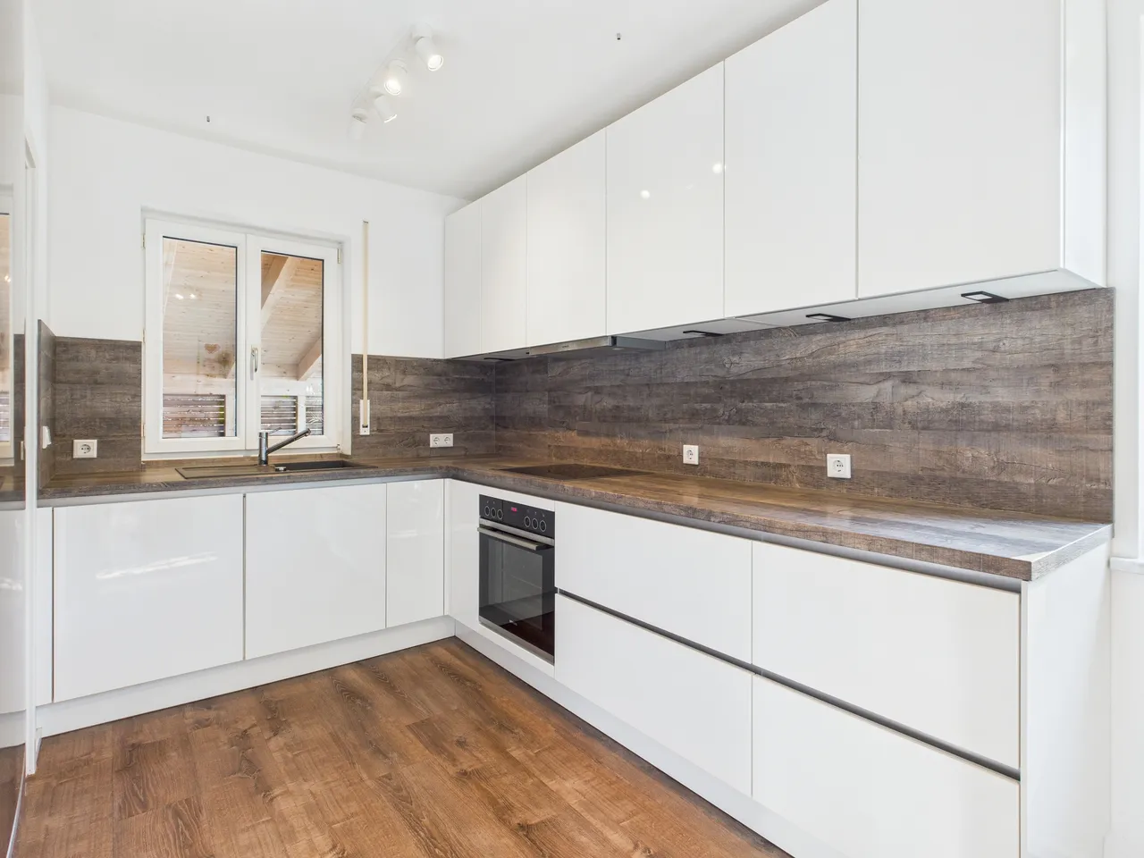 + Es sind Laminatböden in moderner Holzoptik verlegt.