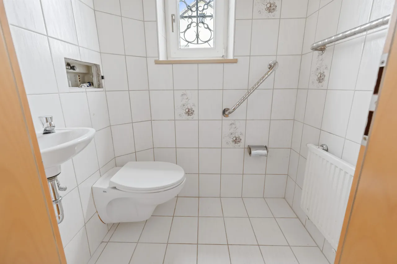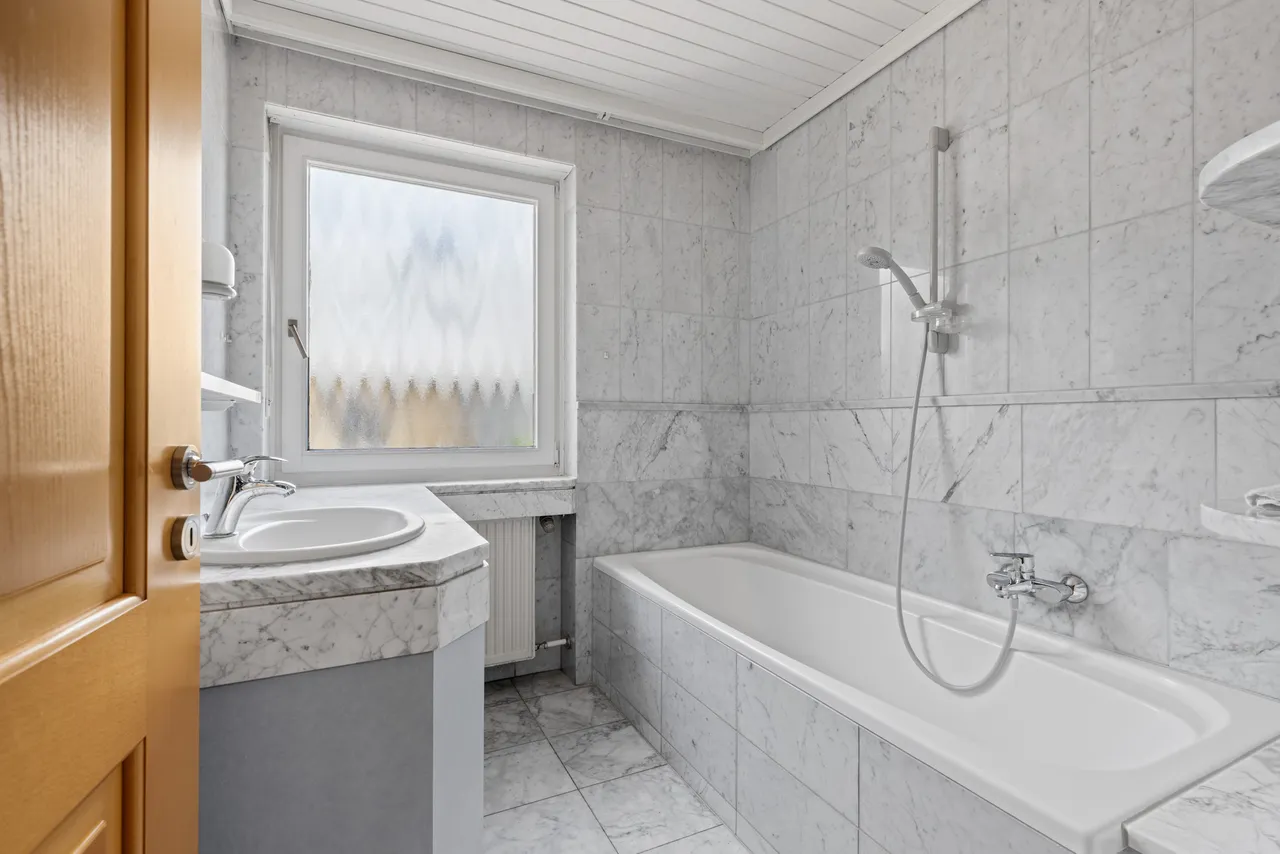 Das Badezimmer im Erdgeschoss ist mit einer Badewanne und einem Waschtisch ausgestattet. Ein Fenster ist vorhanden. Weißer Marmor ist vorhanden. Im Dachgeschoss ist das Badezimmer mit einer Eckbadewanne, einer Dusche und einem Waschtisch ausgestattet. Auch hier ist ein Fenster vorhanden. Beide separaten WCs sind hell gefliest.