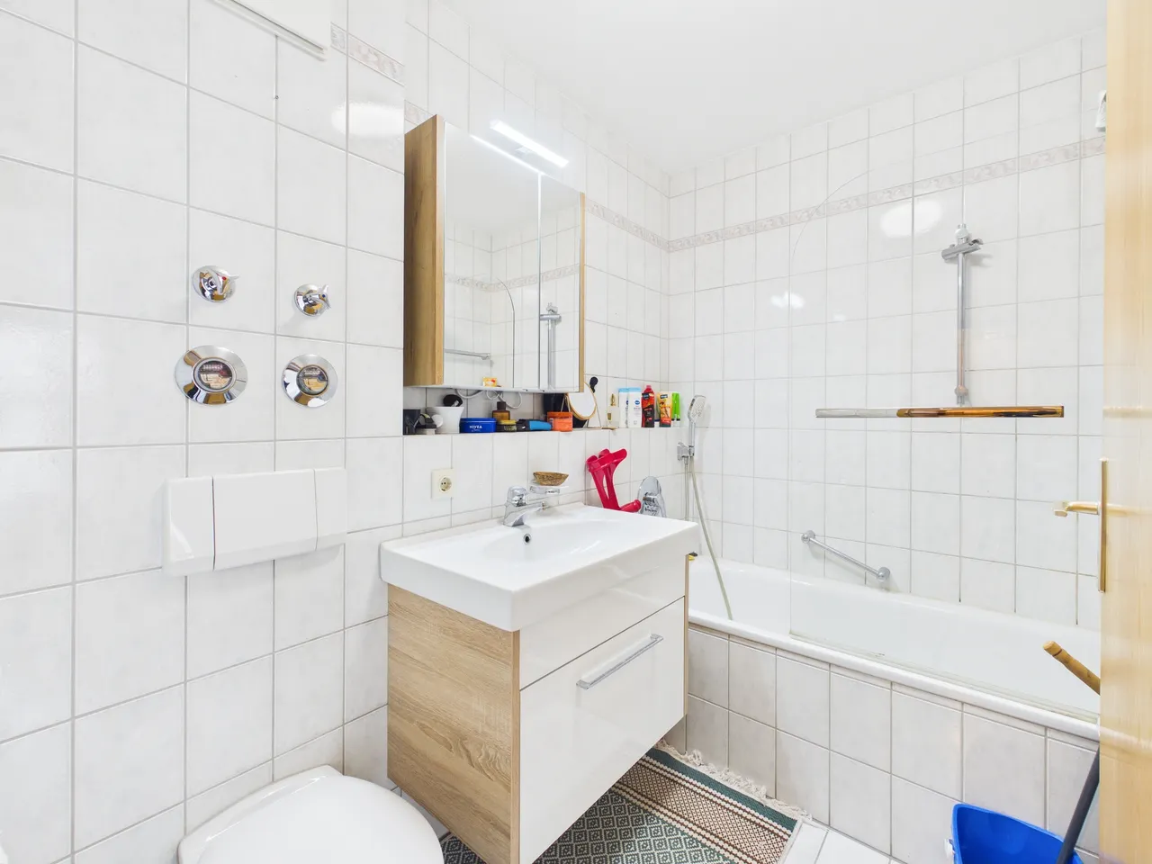 Das innenliegende Badezimmer verfügt über eine Badewanne mit Duschabtrennung, ein WC und ein Waschbecken. Die Waschmaschine und der Trockner können im Keller platziert werden.