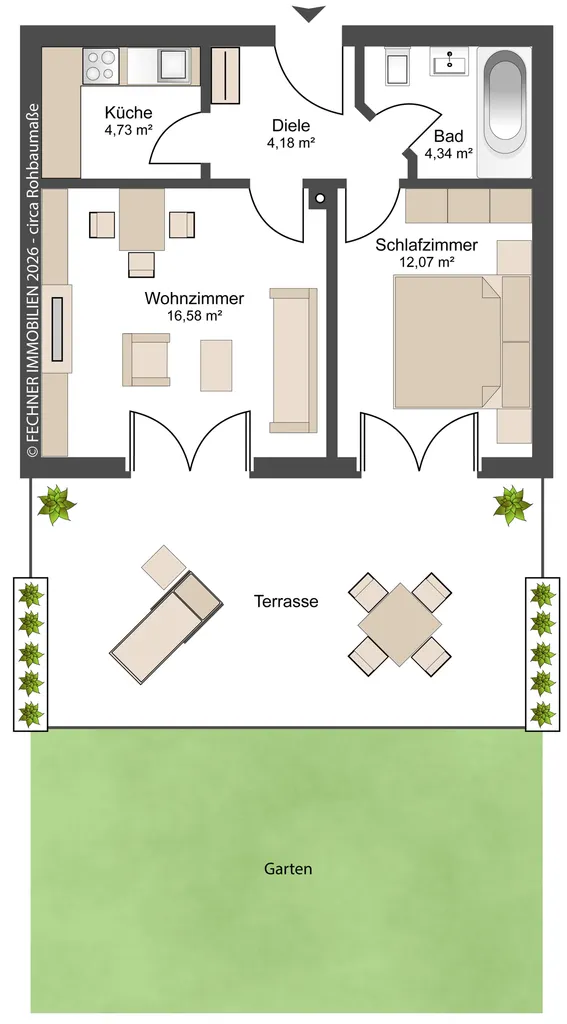 + Auf 2 ZKB erwarten Sie circa 43,64m² Wohnfläche - die große Terrasse wurde anteilig mit nur 3m² hinzugerechnet.