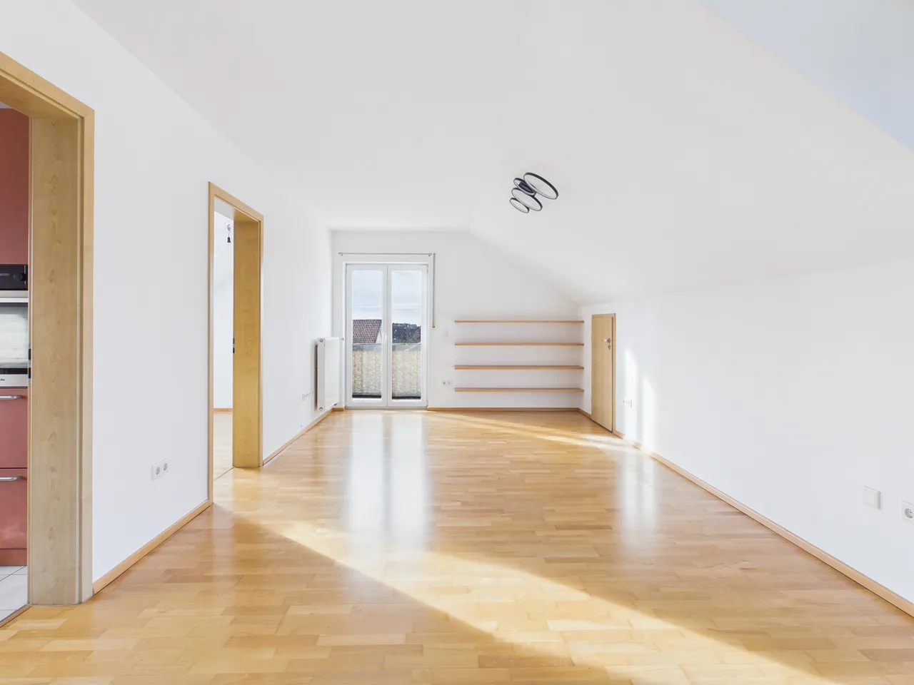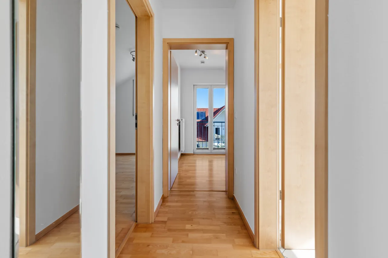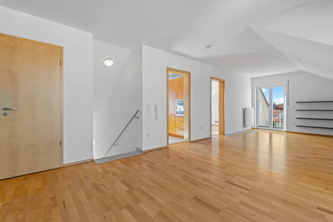Innerhalb der Wohnanlage erstreckt sich die Wohnung über das gesamte Dachgeschoss - der Zugang erfolgt über das 1. Obergeschoss durch ein innenliegendes, zur Wohnung gehörendes Treppenhaus.