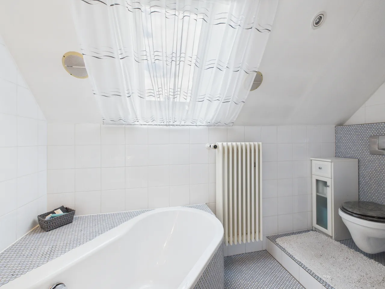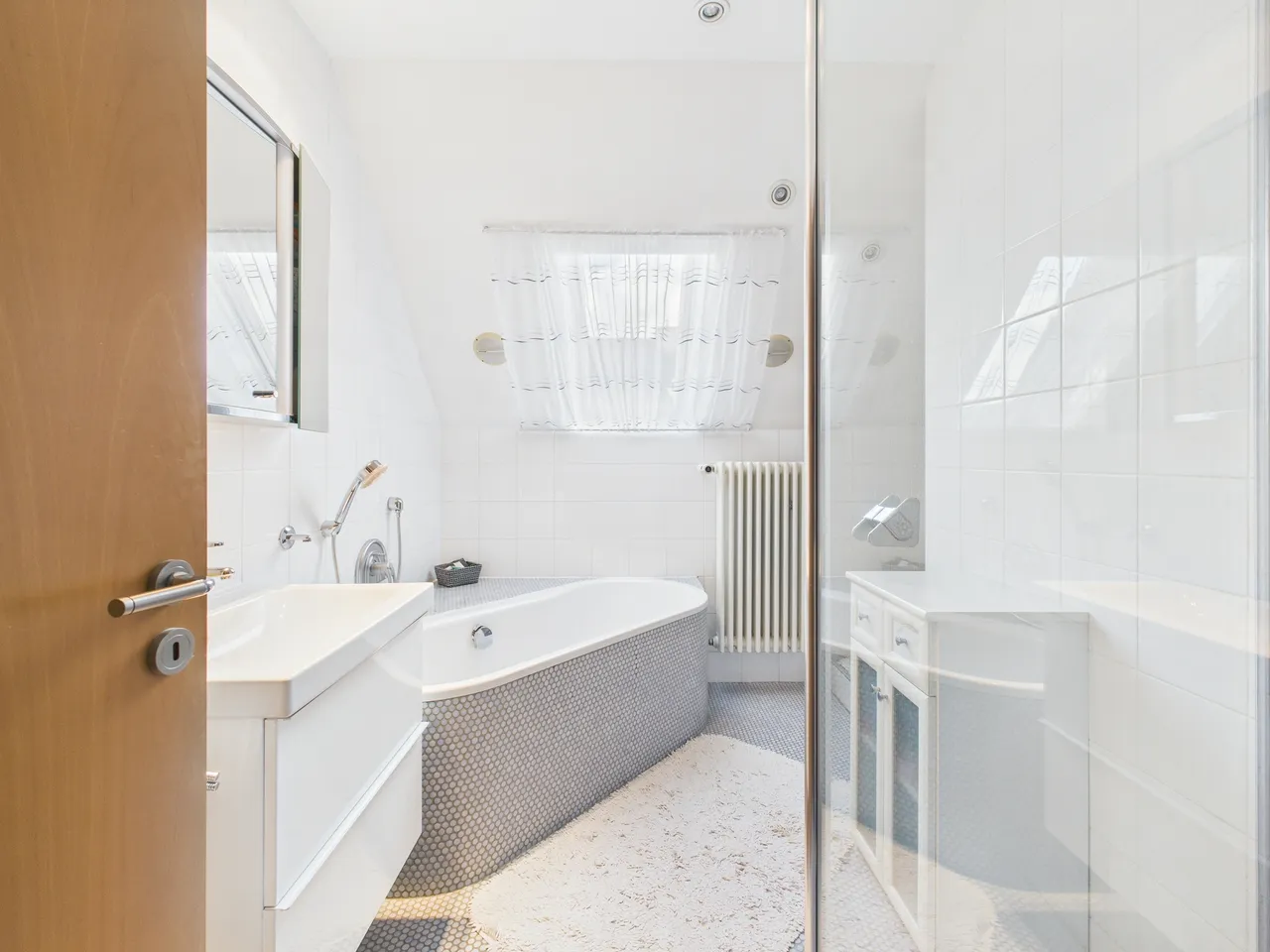 + Das Badezimmer im Dachgeschoss ist moderner - eine Eckbadewanne, eine Dusche, ein WC, ein Waschbecken und ein Fenster sind vorhanden.