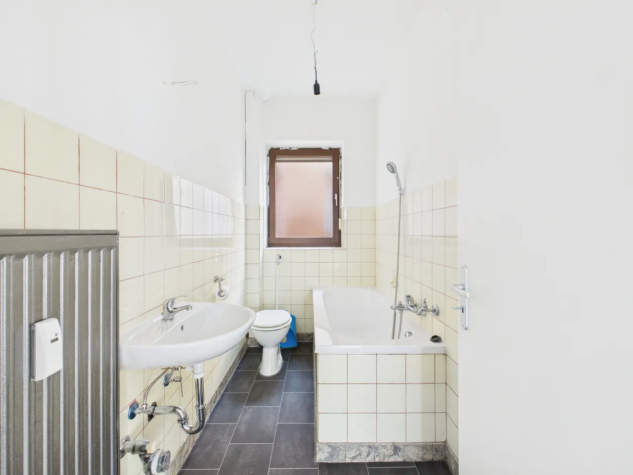 + Bad mit Fenster, WC, Waschbecken, Badewanne und Waschmaschinen-Anschluss