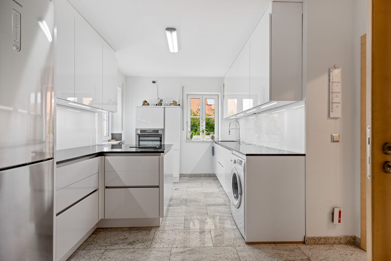 Inventargegenstände: Die auf den Fotos ersichtliche Einbauküche ist inklusive aller Elektro-Großgeräte bereits im Kaufpreis enthalten. Die Küche verfügt über eine zeitlose Optik dank der weißen Fronten - die Granit-Arbeitsplatte ist ebenso langlebig, pflegeleicht und unempfindlich.
