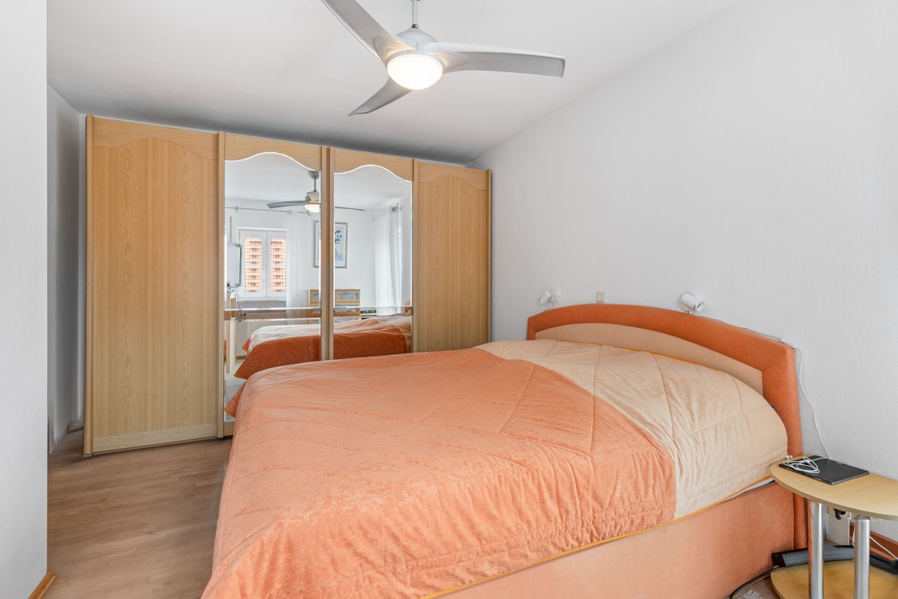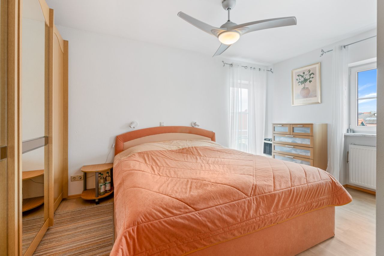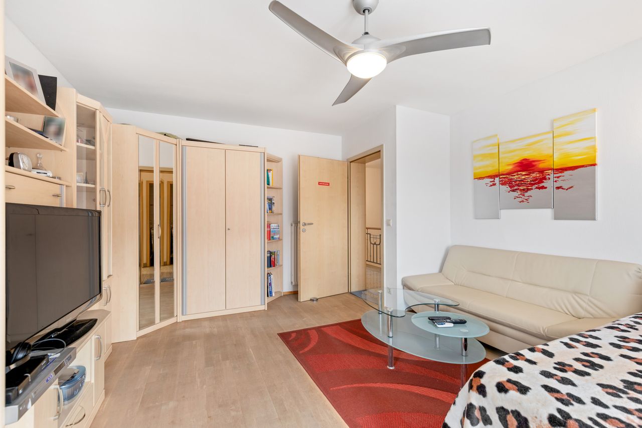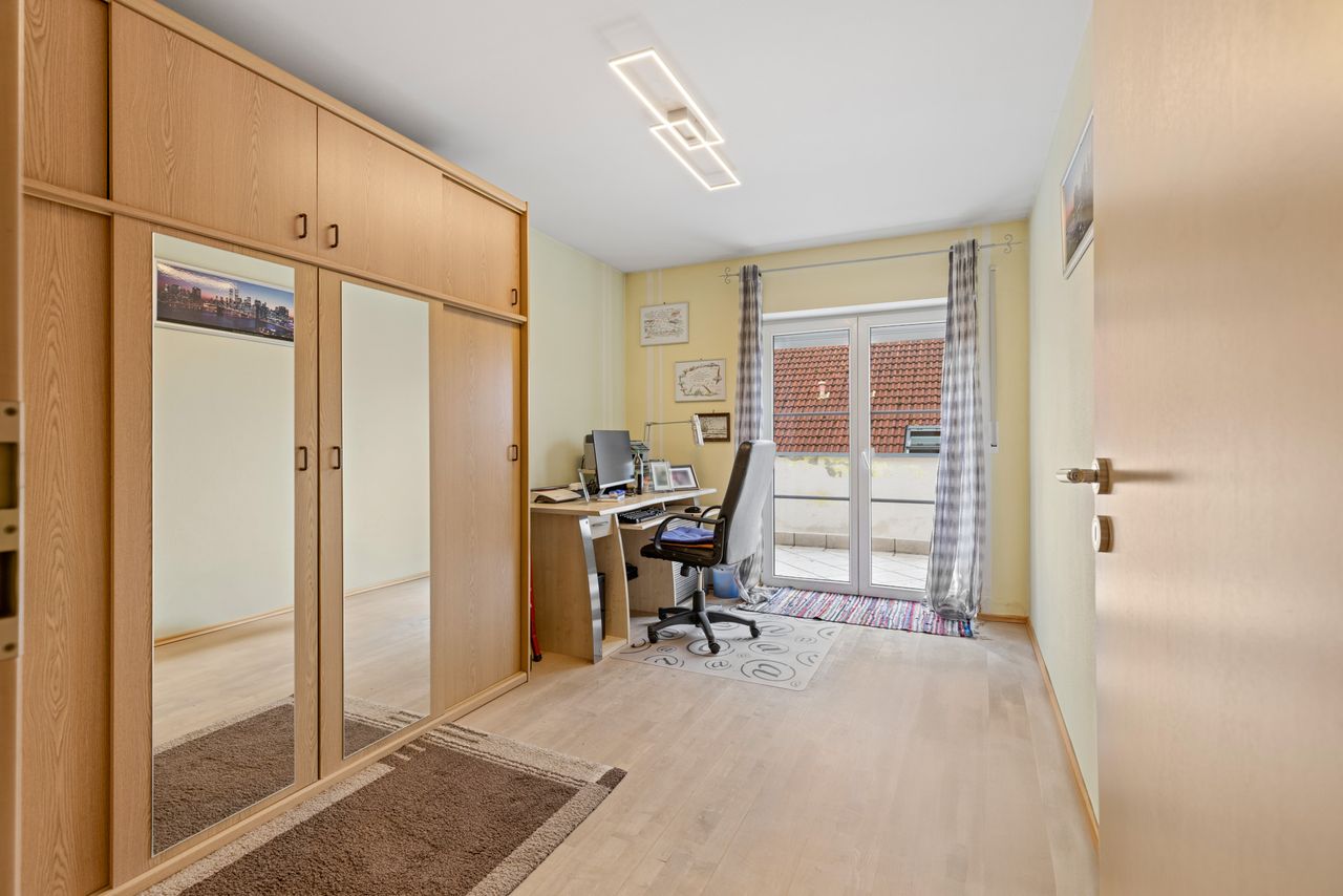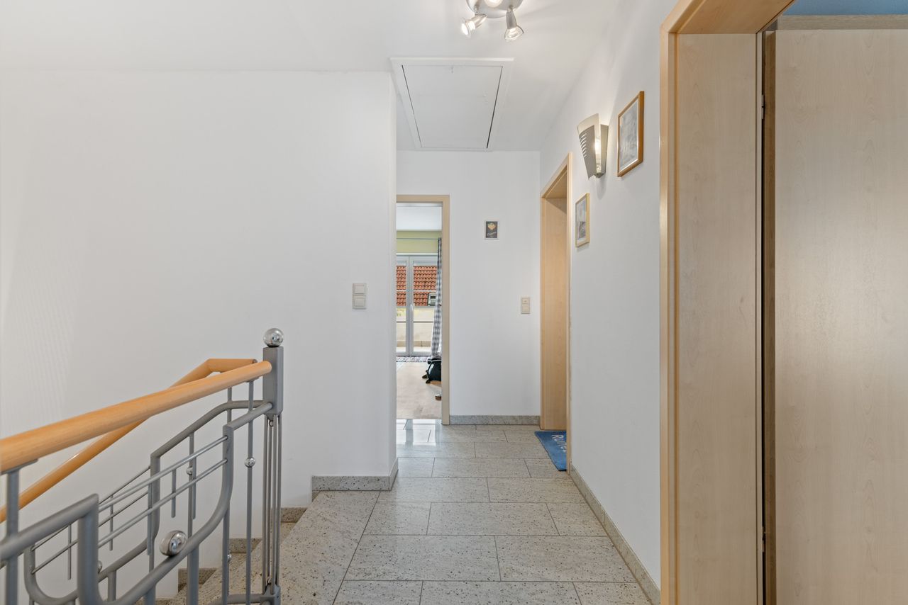 + In den Schlafräumen des Obergeschosses ist ein Echtholz-Parkettbodenbelag verlegt (amerikanischer Ahorn, schleifbar).