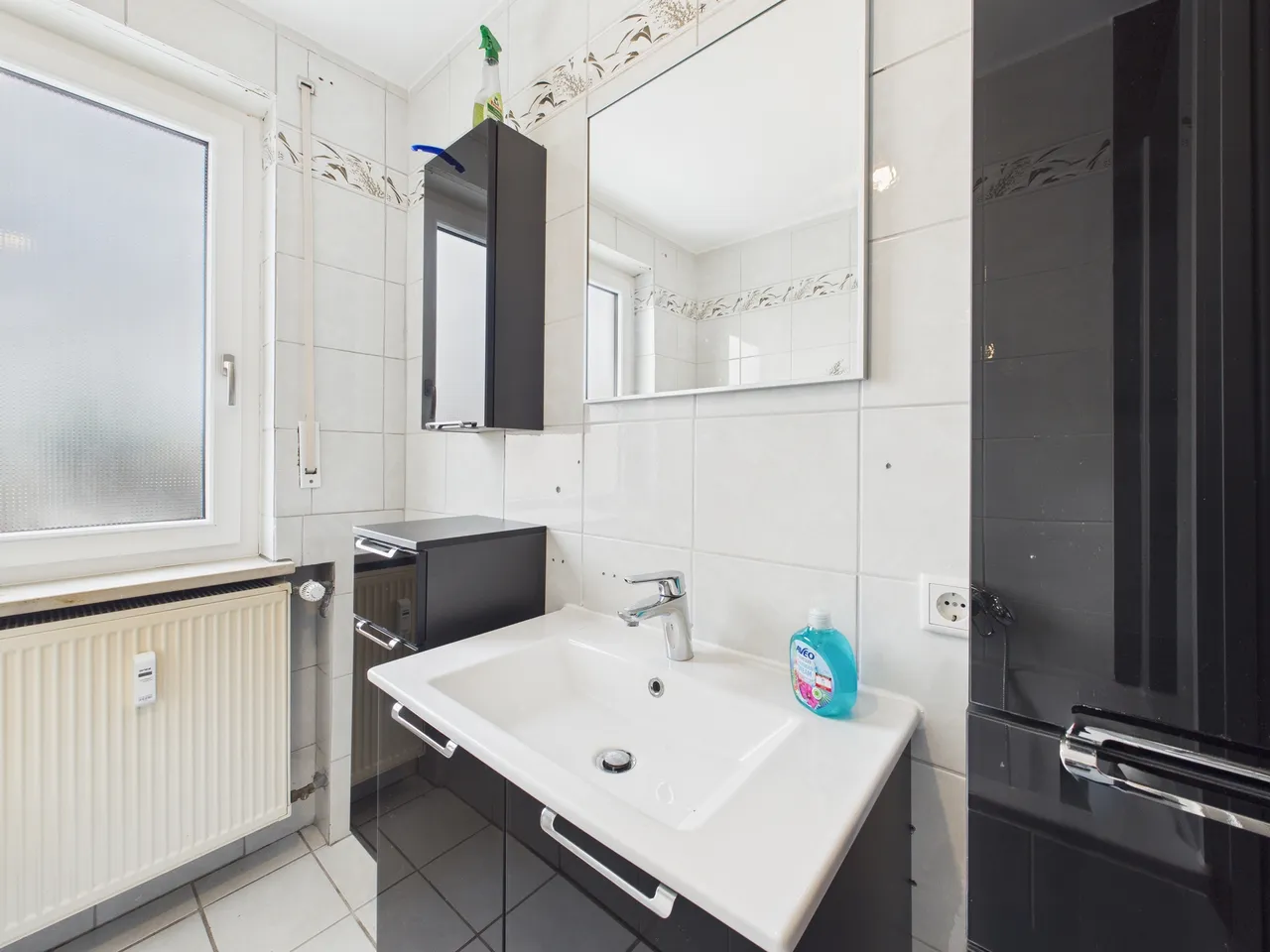 Das Badezimmer verfügt über ein Fenster, eine Badewanne, eine Dusche und einen Waschtisch mit Spiegel und Hängeschränken. Die Toilette befindet sic in einem separaten Raum. Auch hier ist ein Fenster vorhanden.