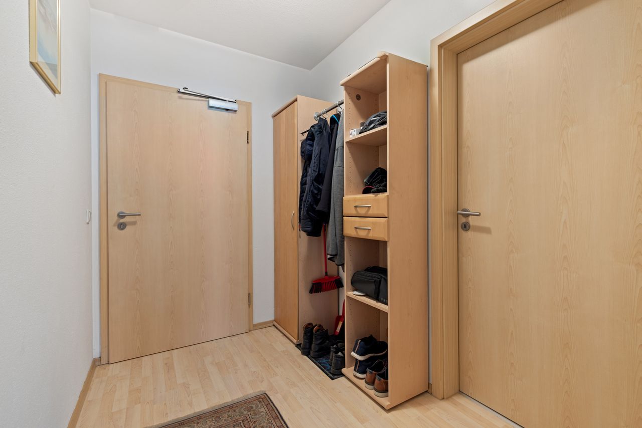 + Passend zu den Bodenbelägen wurde die Wohnung mit hellen Holztüren ausgestattet.