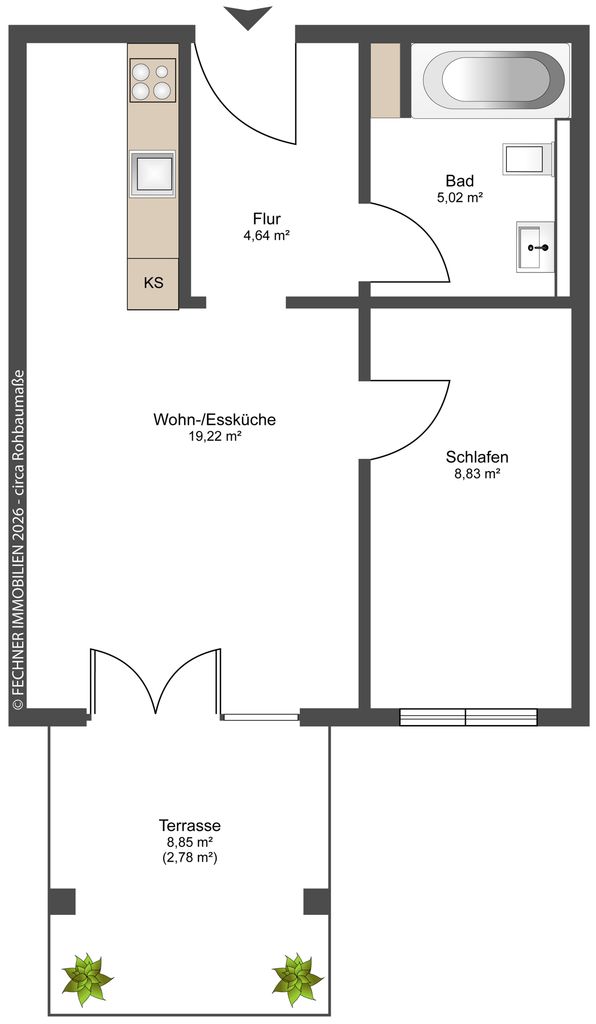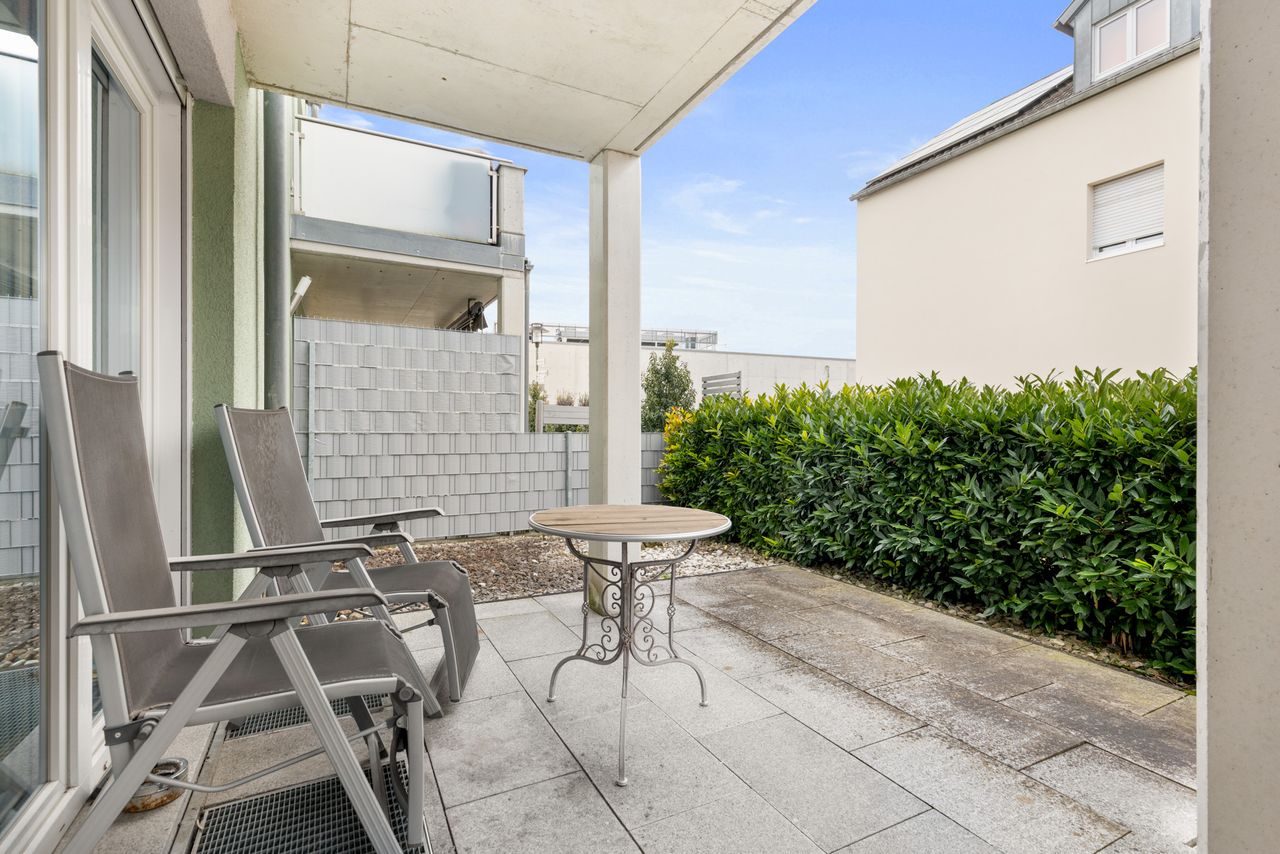 + 2 ZKB bei circa 39m² Wohnfläche, Erdgeschoss mit Terrasse in Westausrichtung.