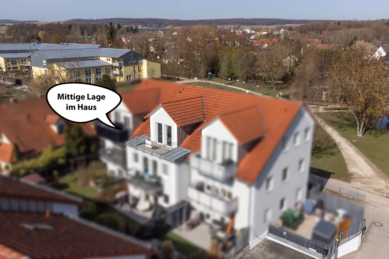 Die Wohnung befindet sich in der Nähe des Köschinger Marktplatzes in unmittelbarer Nähe zu einer schön angelegten Grünanlage. Innerhalb des Mehrfamilienhauses befindet sich die Wohnung im 2. Obergeschoss = Dachgeschoss in mittiger Lage.