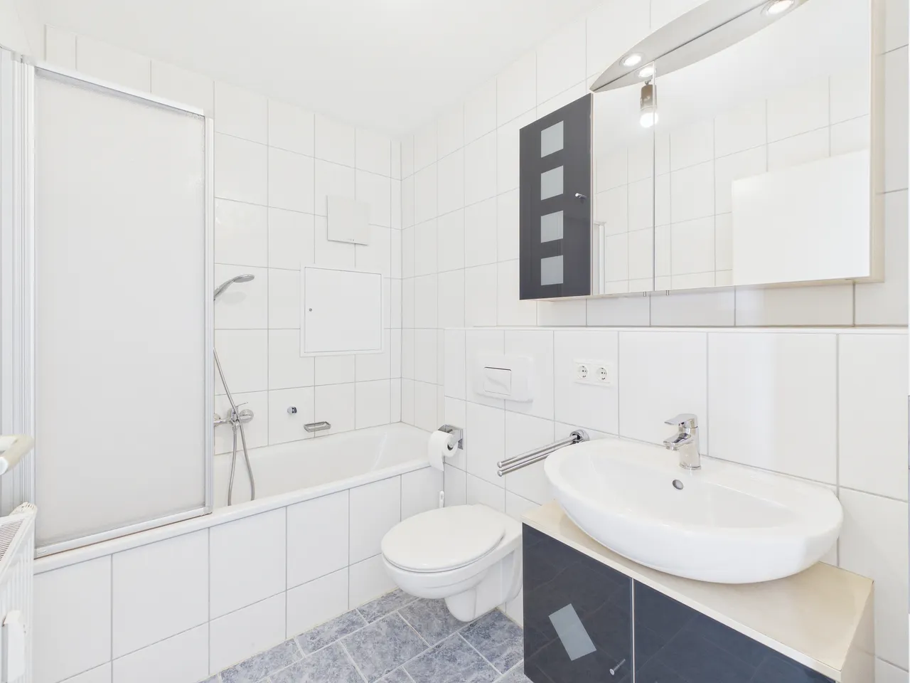 + Das Badezimmer verfügt über eine Badewanne, eine Dusche, ein WC und ein Waschbecken.
