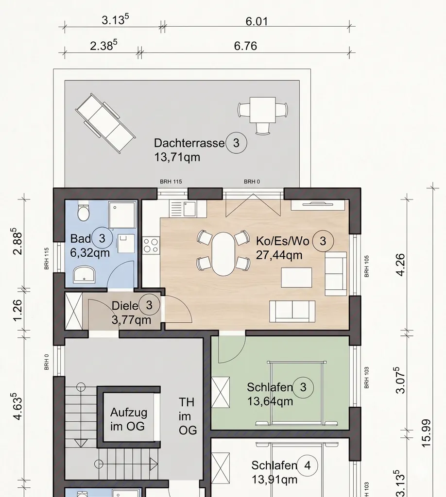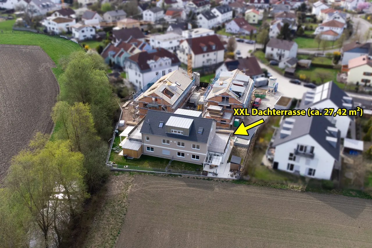 + 2 ZKB im 1. Obergeschoss (mit Aufzug) bei circa 64,88 m² Wohnfläche und XXL-Dachterrasse mit circa 27,42 m² Nutzfläche!