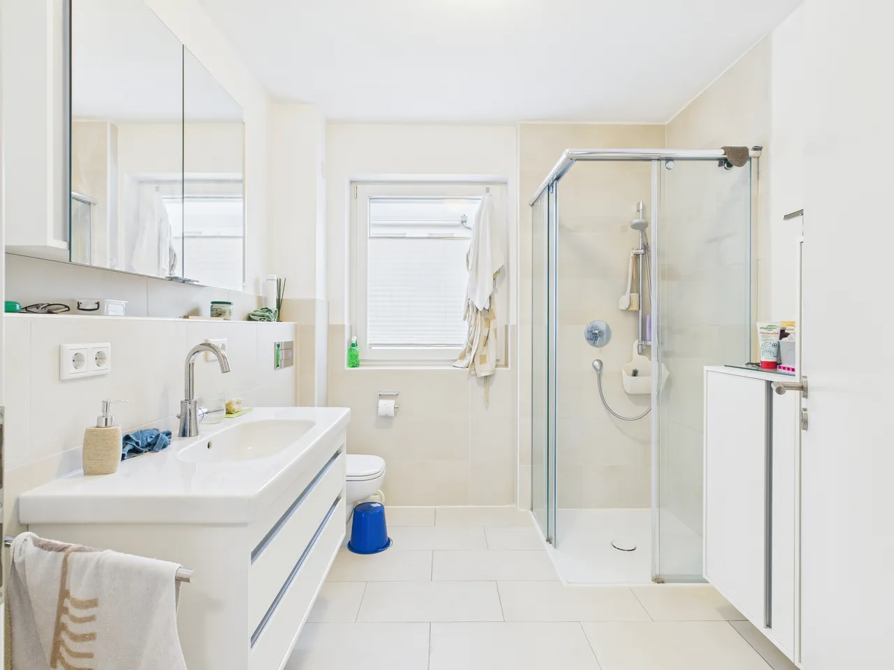 Das Bad ist ansprechend hell gefliest und verfügt über ein großes Fenster. Die Dusche (90x90cm) ist nahezu bodengleich ausgeführt und bequem begehbar. Die Duschkabine ist aus Klarglas. Der installierte Spiegelschrank, der Waschtisch mit Unterschrank und zwei weitere Badmöbel sind ebenfalls Bestandteil des Mietangebotes.