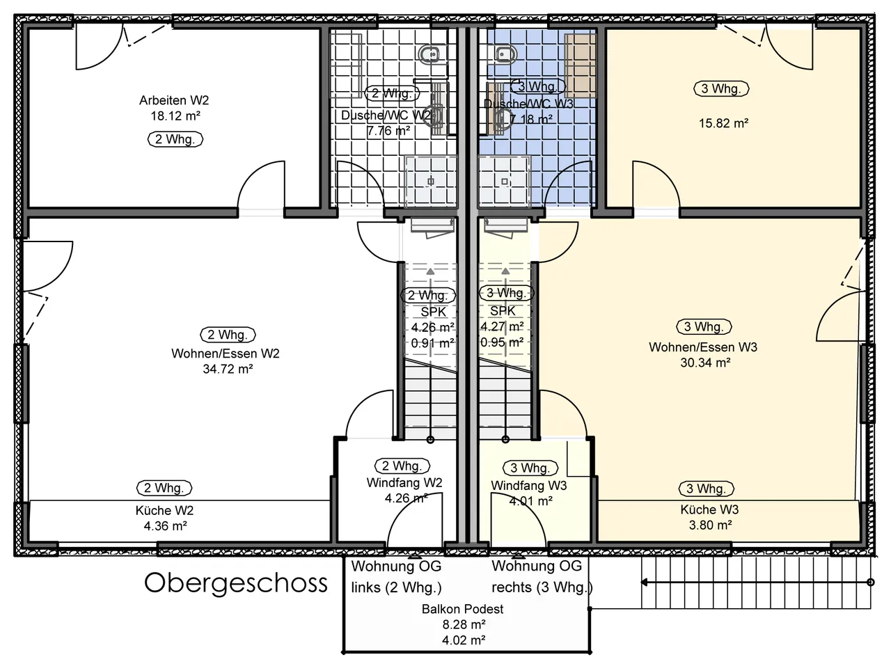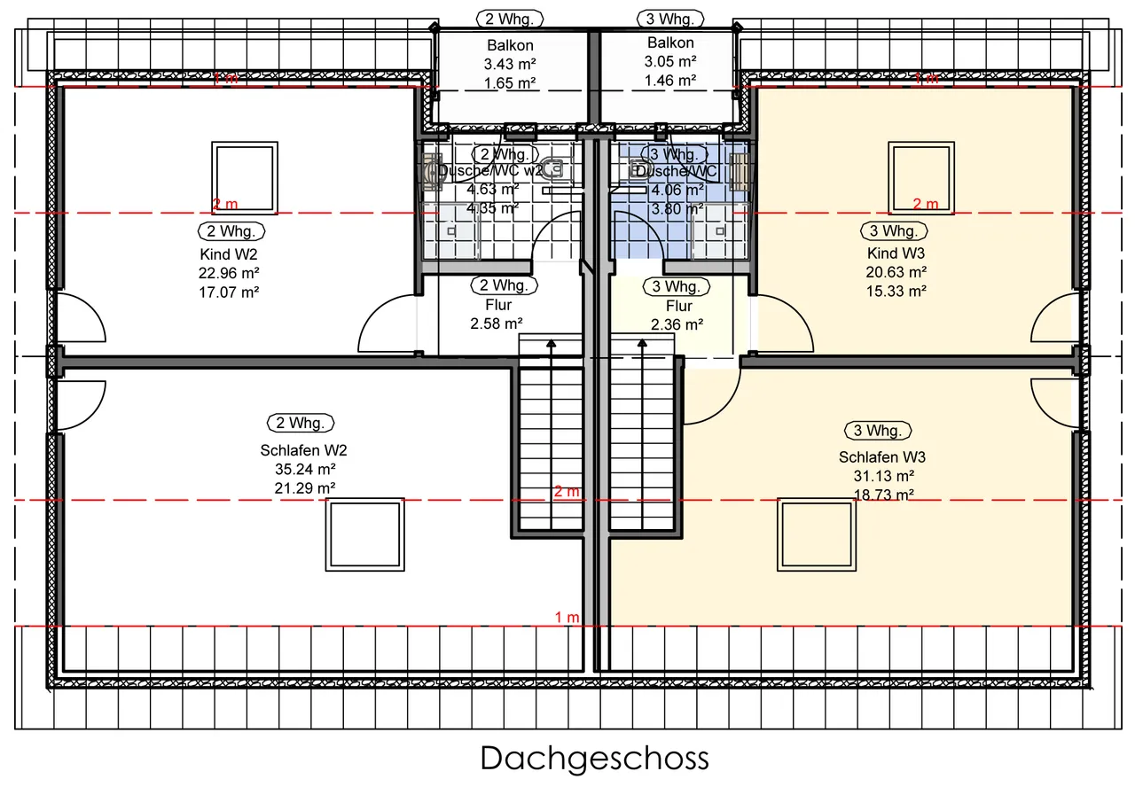 Das Badezimmer im 1. Obergeschoss ist mit einer begehbaren Dusche, einem Waschbecken, einem WC und einem Fenster ausgestattet. Das etwas kleinere Badezimmer im Dachgeschoss beinhaltet ebenfalls eine Dusche, ein Waschbecken, ein WC und ein Tageslicht-Fenster mit Zugang zum Balkon.