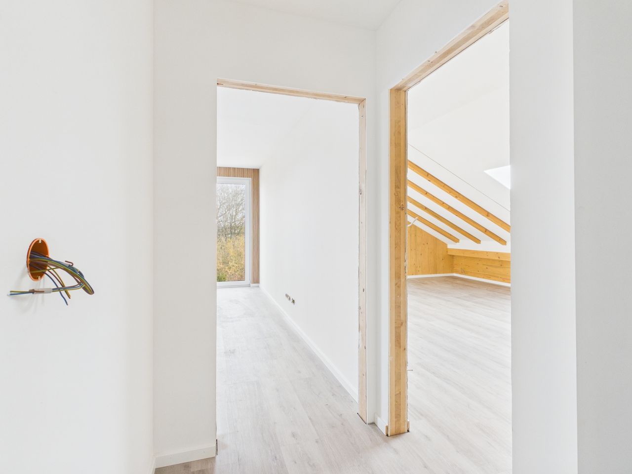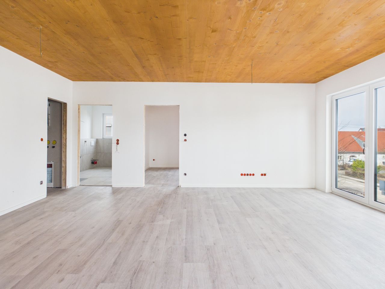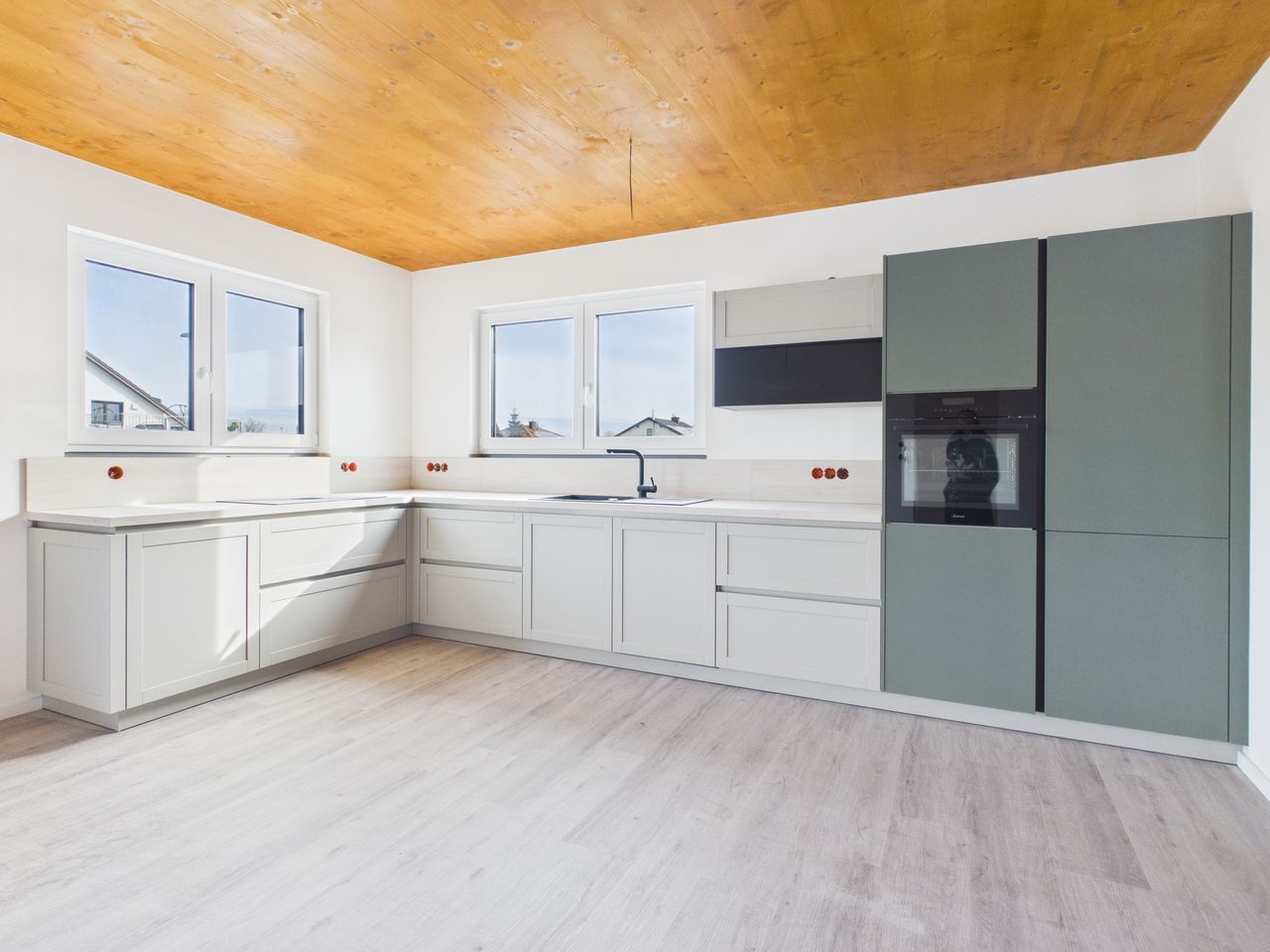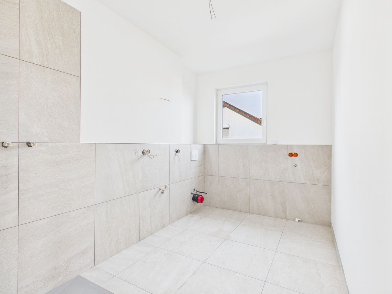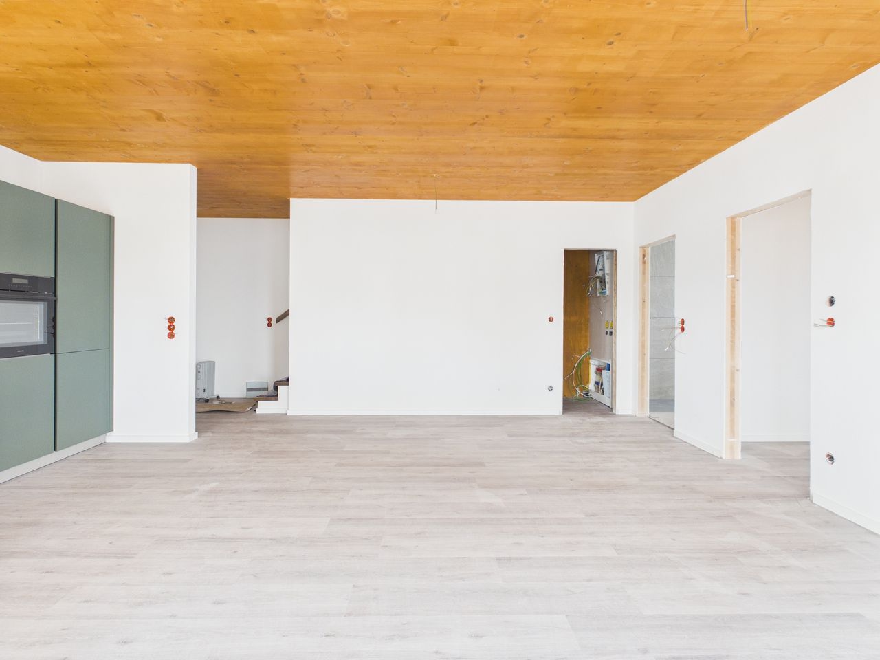 Alle Wohn- und Schlafräume sind mit hochwertigen Vinylböden in Eiche-Echtholzoptik ausgestattet. Die restlichen Räume und die Sanitärbereiche sind mit Feinsteinzeug-Fliesen gefliest. Alle Räume verfügen über eine Fußbodenheizung.