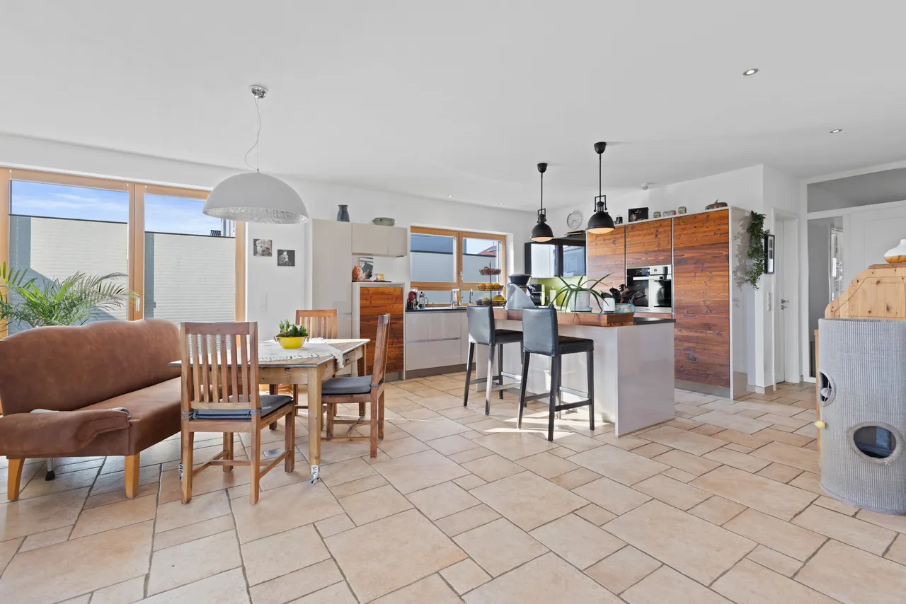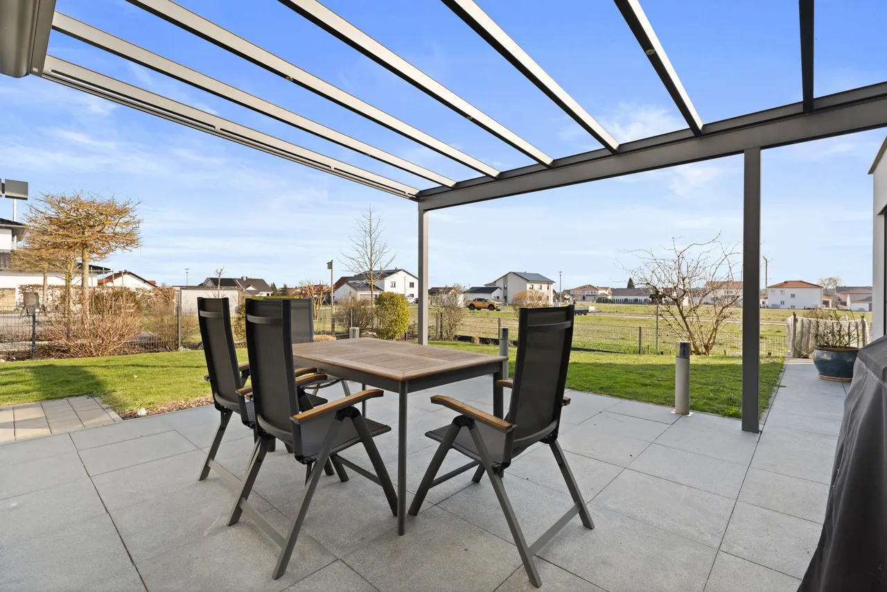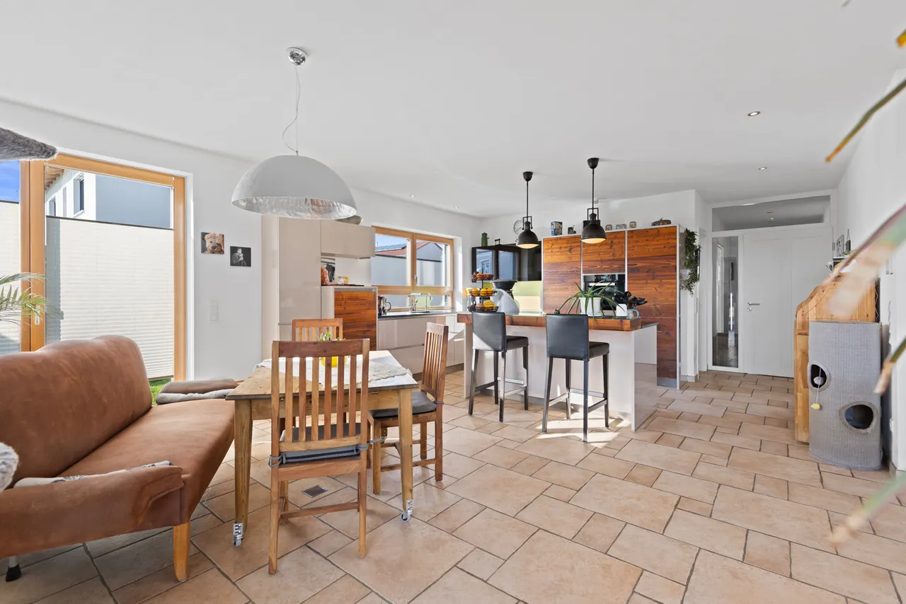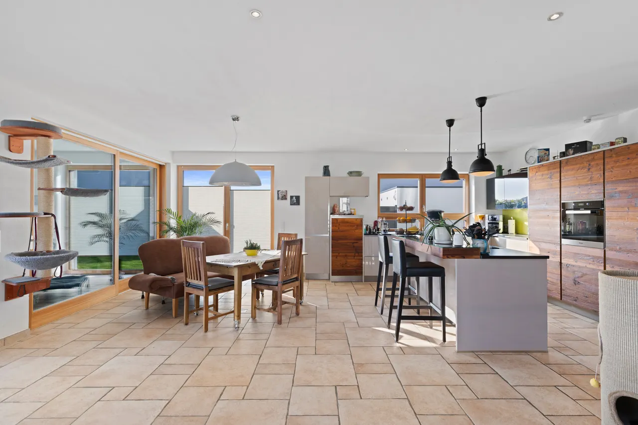 Die offene Einbauküche (bereits im Kaufpreis enthalten) gliedert sich harmonisch in das Raumkonzept ein und macht das gemeinsame Kochen zum Erlebnis. Von hier aus öffnet sich der Raum zur einladenden Terrasse (mit elektrischer Markise / Beleuchtung) und dem liebevoll angelegten, pflegeleichten Garten. Genießen Sie entspannte Stunden im Freien, während die smarte Bewässerungsanlage die Gartenarbeit fast von ganz allein erledigt.