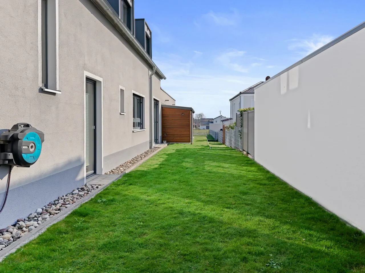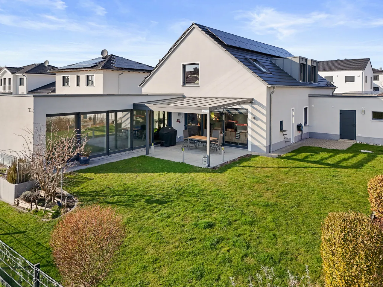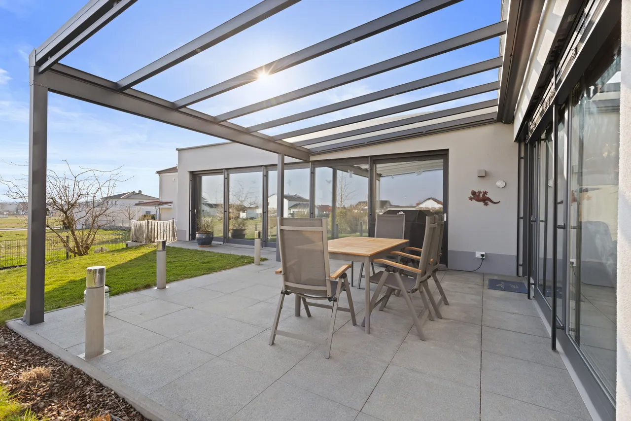 Die offene Einbauküche (bereits im Kaufpreis enthalten) gliedert sich harmonisch in das Raumkonzept ein und macht das gemeinsame Kochen zum Erlebnis. Von hier aus öffnet sich der Raum zur einladenden Terrasse (mit elektrischer Markise / Beleuchtung) und dem liebevoll angelegten, pflegeleichten Garten. Genießen Sie entspannte Stunden im Freien, während die smarte Bewässerungsanlage die Gartenarbeit fast von ganz allein erledigt.