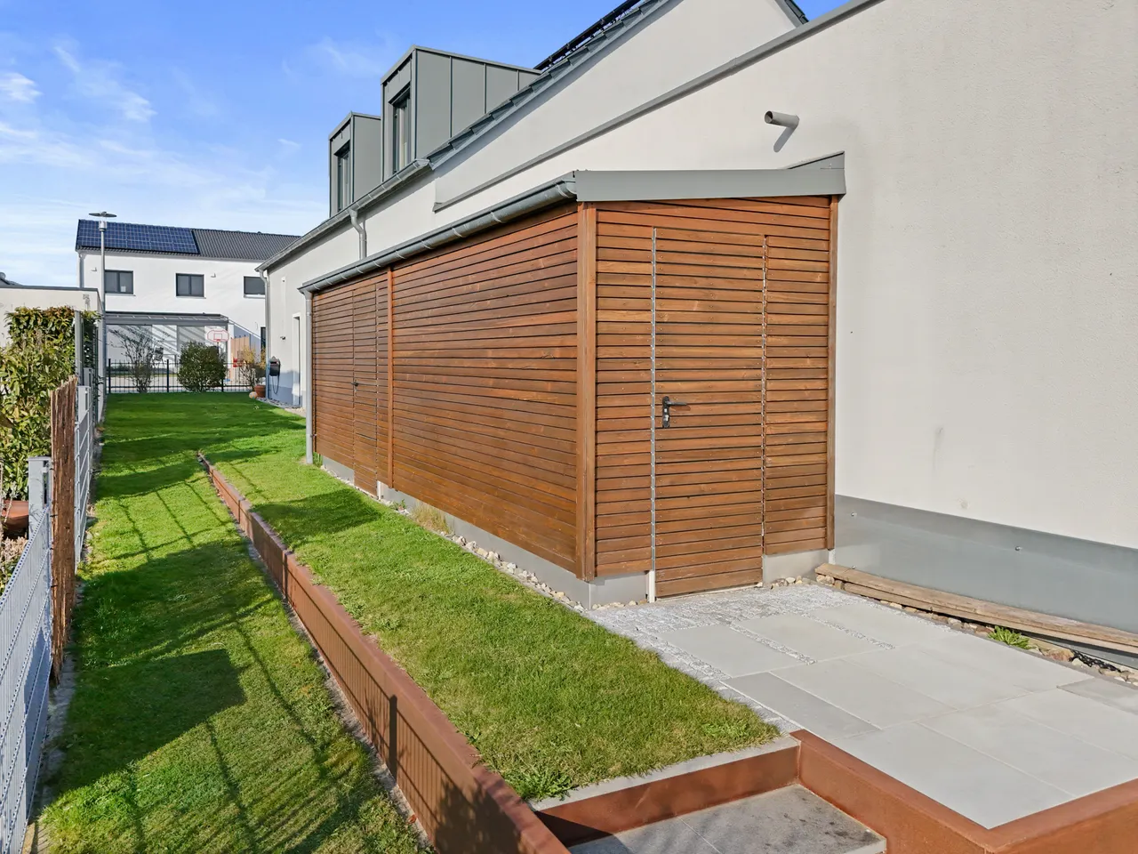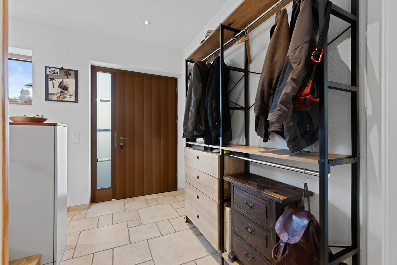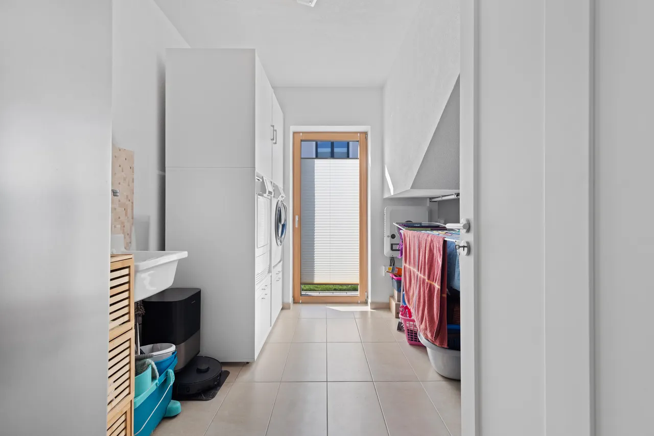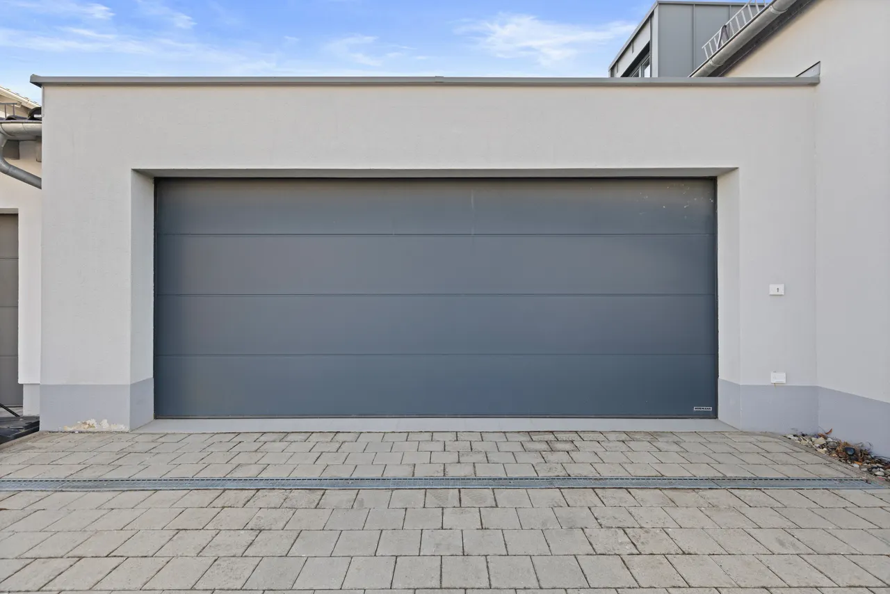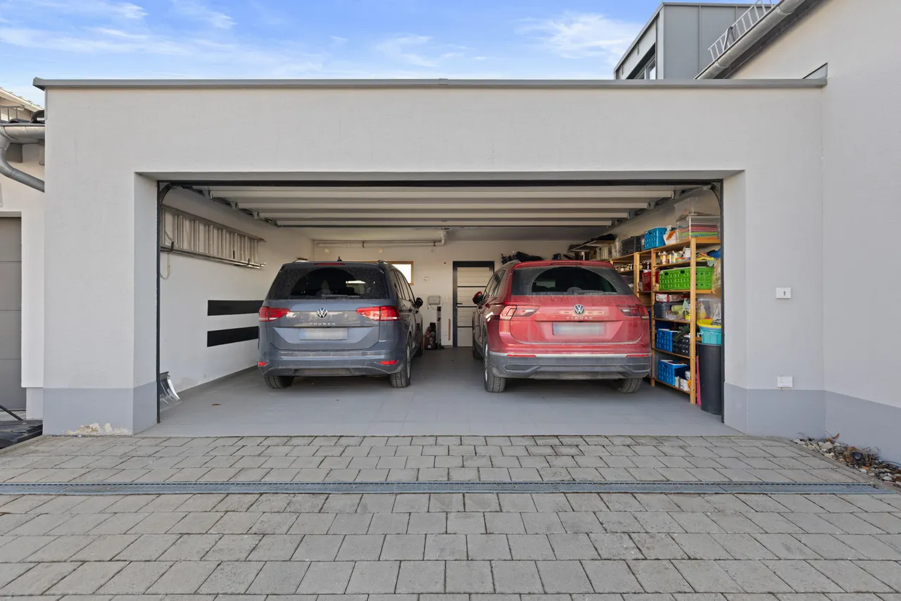 Ihre Fahrzeuge stehen sicher in der geräumigen Doppelgarage, die komfortabel mit einem elektrischen Torantrieb ausgestattet ist. Ein besonders durchdachtes Detail: Auf der Rückseite der Garage befindet sich ein direkter Zugang, der Sie bequem in den Garten führt.
