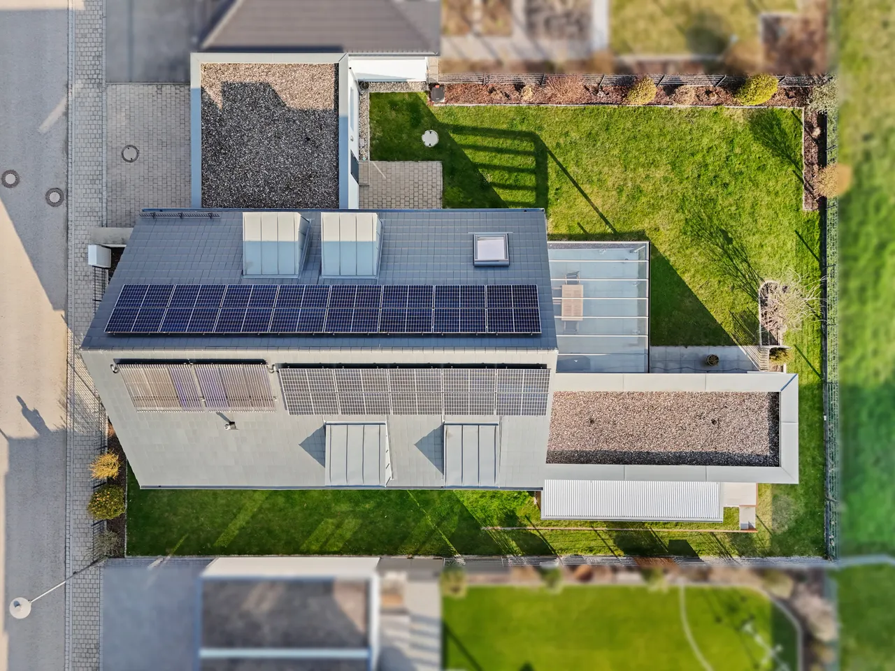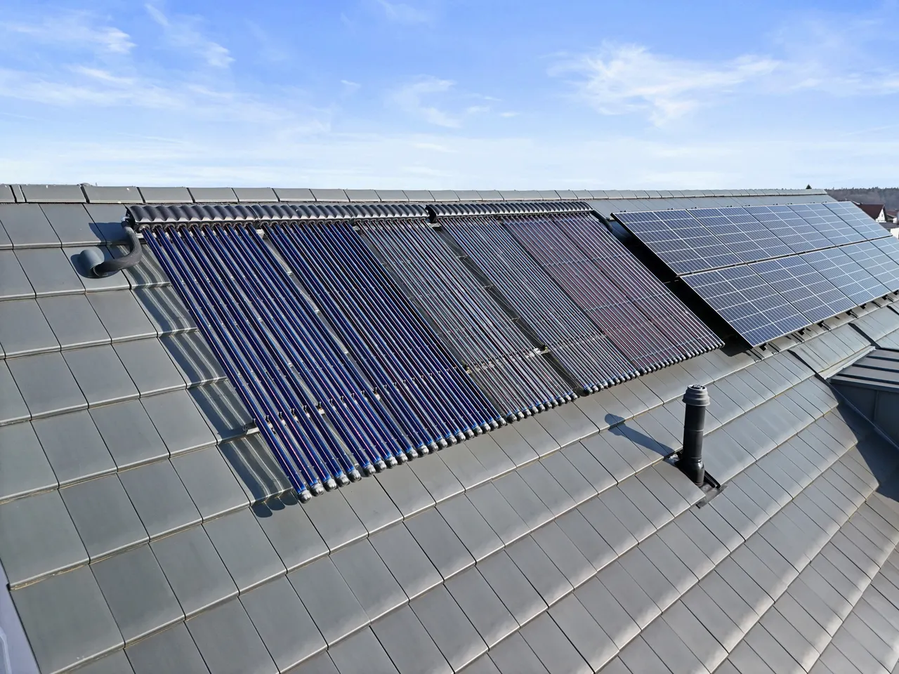 Intelligentes Heizen & Wasser: Gas-Zentralheizung, unterstützt durch leistungsstarke Solarthermie (Hochleistungsvakuumröhren) zur Warmwasseraufbereitung, inklusive hygienischer Frischwasserstation.