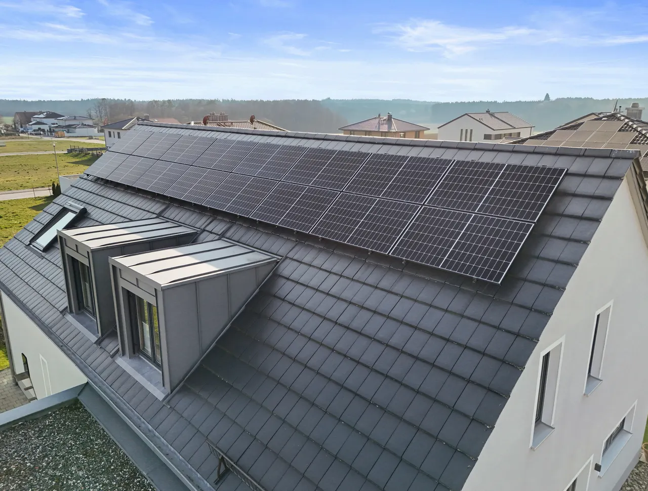 Unabhängige Stromversorgung: Photovoltaikanlage (9,75 kWp) gekoppelt mit einem 5,12 kWh Batteriespeicher.