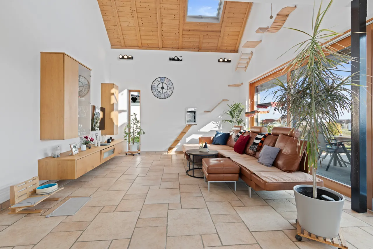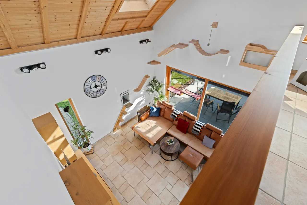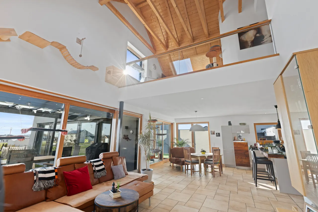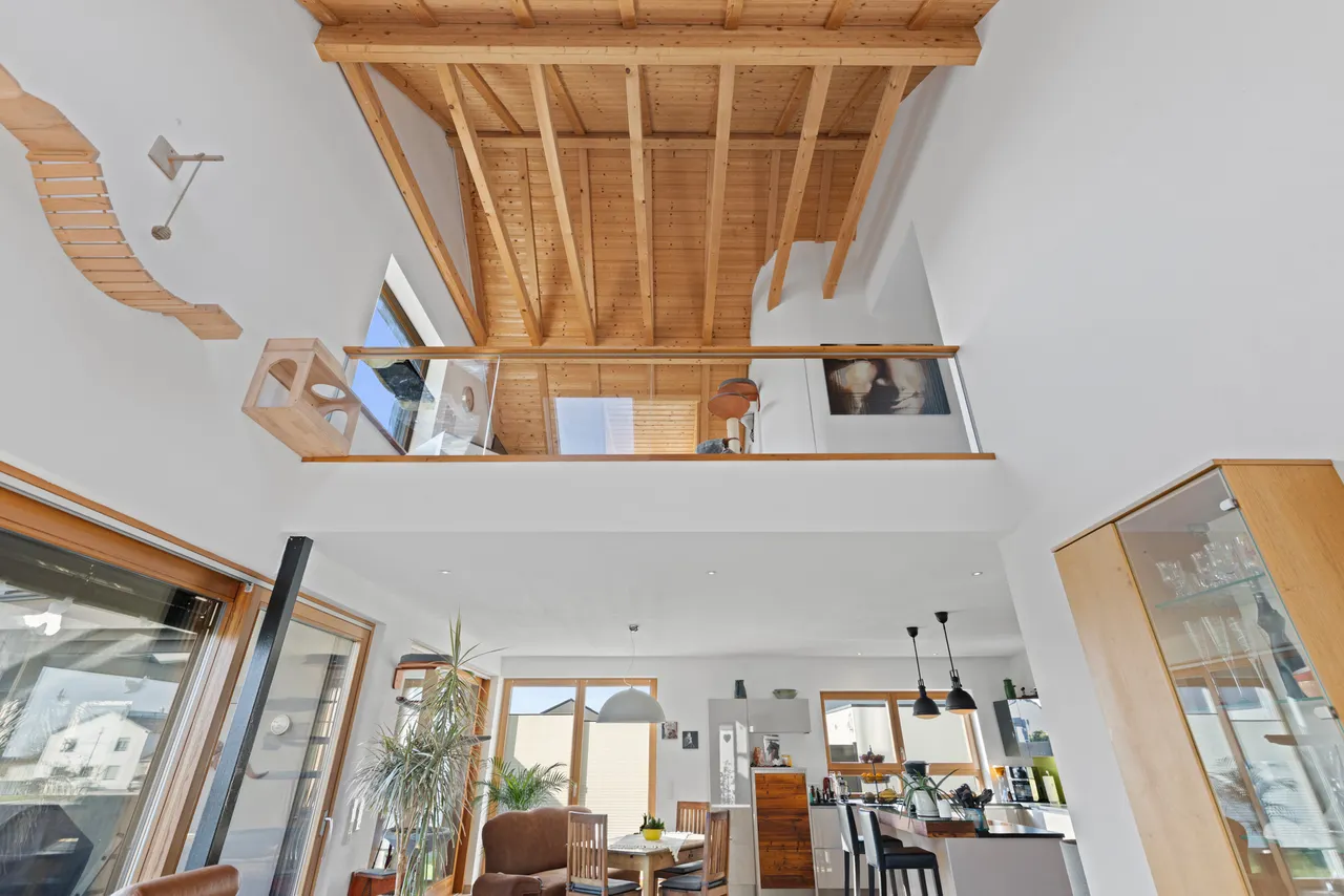 Das absolute Herzstück des Hauses ist der offene Wohnbereich: Der Luftraum, der den Blick bis zum freiliegenden Sichtdachstuhl und der eleganten Galerie im Dachgeschoss freigibt, schafft ein unvergleichliches, weites Raumgefühl. Ein bereits vorhandener Kaminanschluss bietet Ihnen zudem die perfekte Gelegenheit, mit einem Schwedenofen an kühlen Abenden für gemütliche, knisternde Wärme zu sorgen.