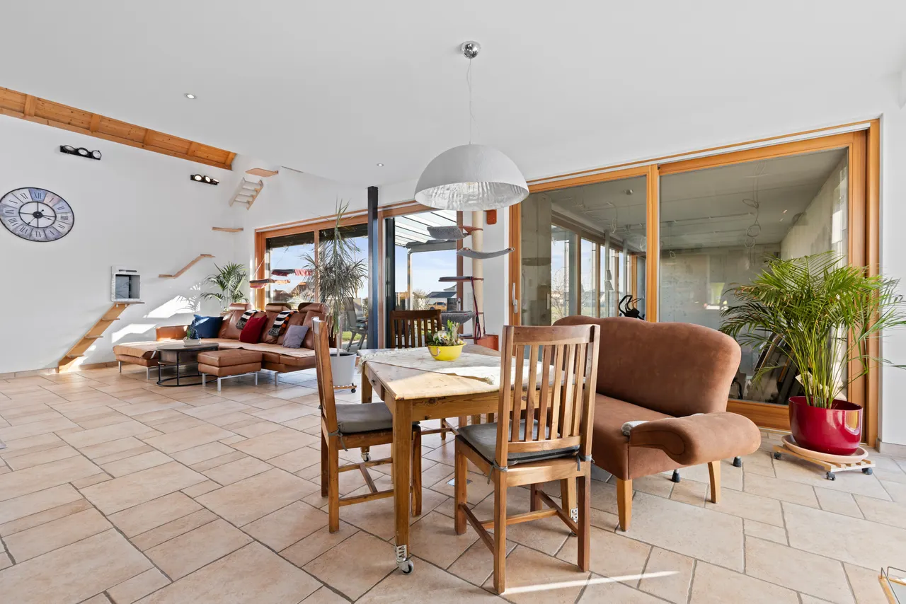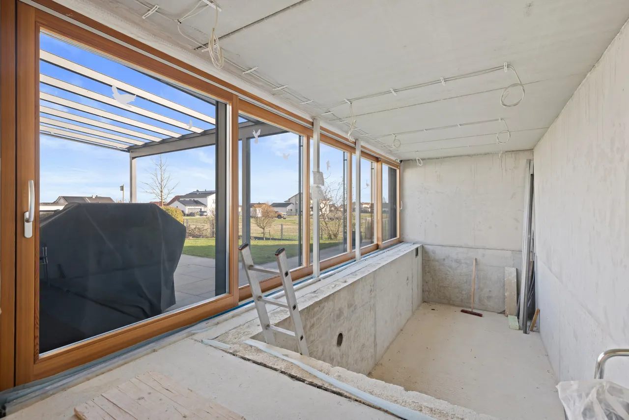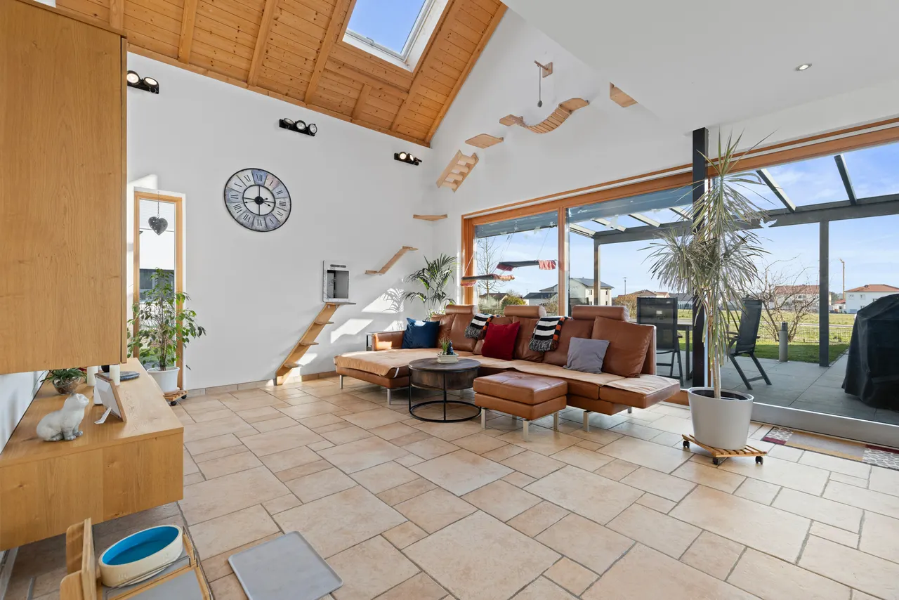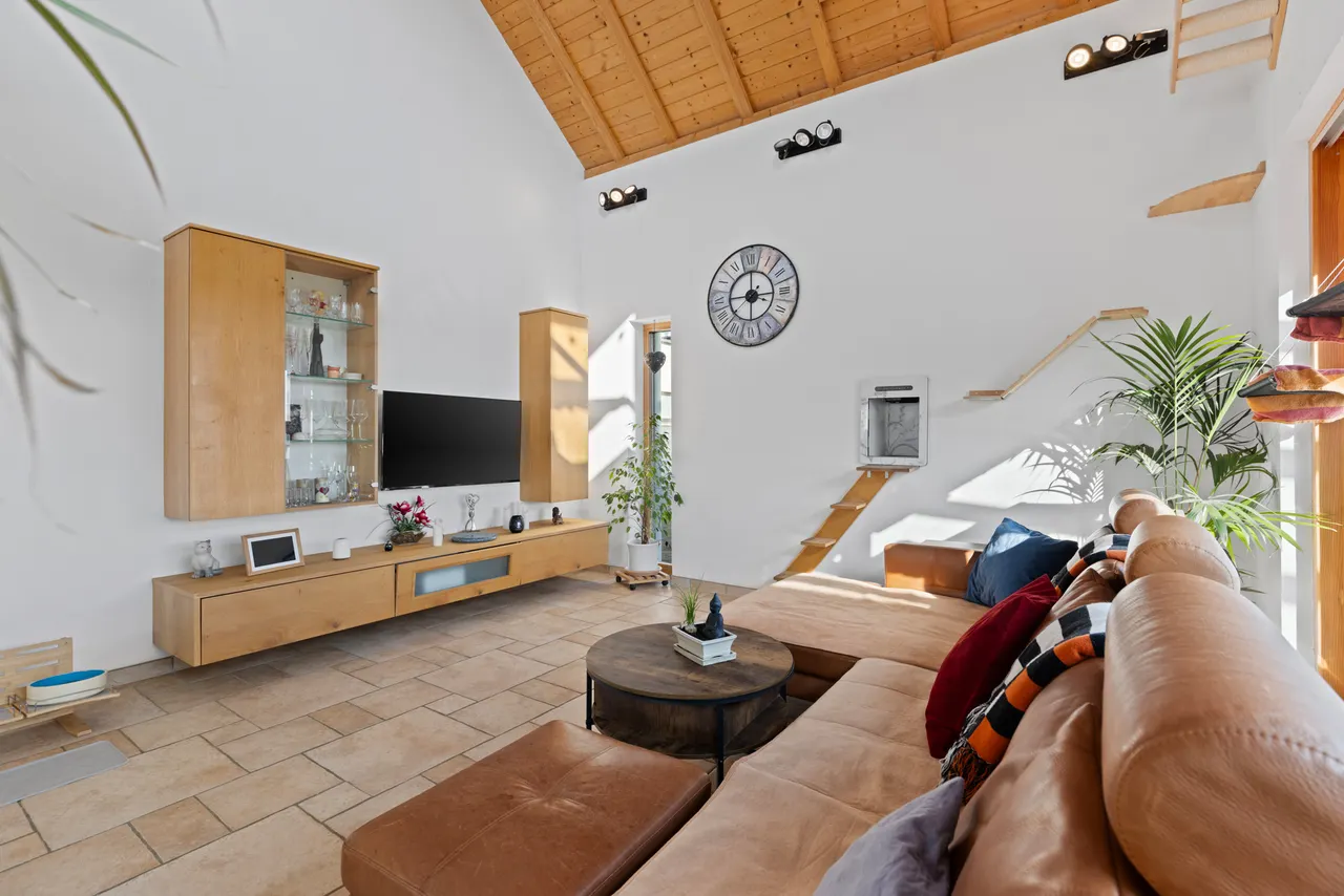 Das absolute Herzstück des Hauses ist der offene Wohnbereich: Der Luftraum, der den Blick bis zum freiliegenden Sichtdachstuhl und der eleganten Galerie im Dachgeschoss freigibt, schafft ein unvergleichliches, weites Raumgefühl. Ein bereits vorhandener Kaminanschluss bietet Ihnen zudem die perfekte Gelegenheit, mit einem Schwedenofen an kühlen Abenden für gemütliche, knisternde Wärme zu sorgen.