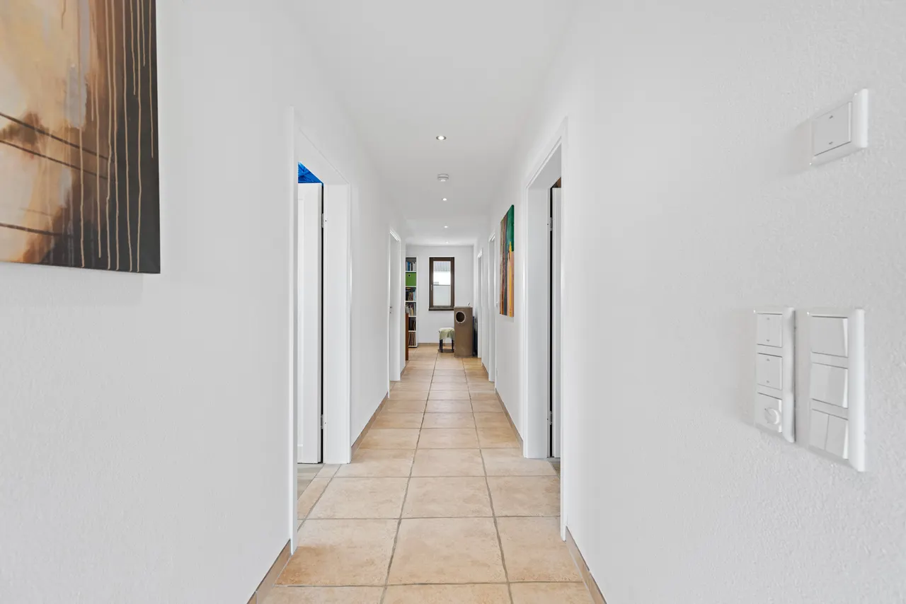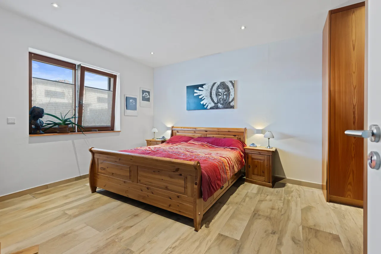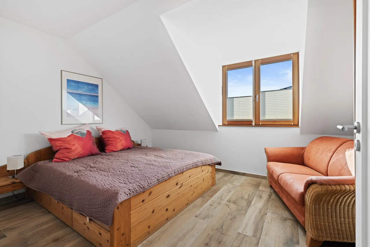 Wohnliche Schlafräume: Das Dachgeschoss ist ebenfalls durchgehend gefliest, wobei in den Schlafräumen eine warme Holzoptik für eine gemütliche Atmosphäre sorgt.