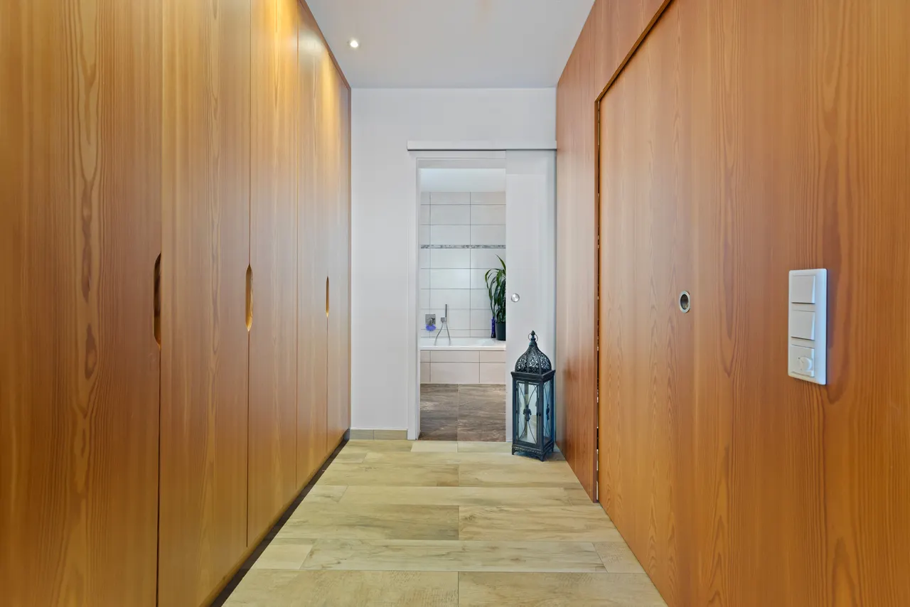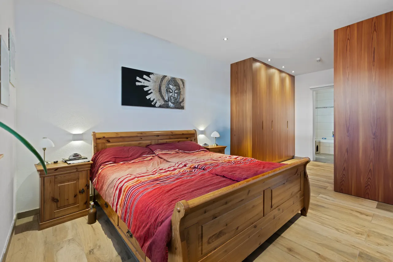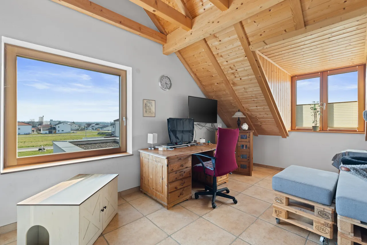 Wohnliche Schlafräume: Das Dachgeschoss ist ebenfalls durchgehend gefliest, wobei in den Schlafräumen eine warme Holzoptik für eine gemütliche Atmosphäre sorgt.