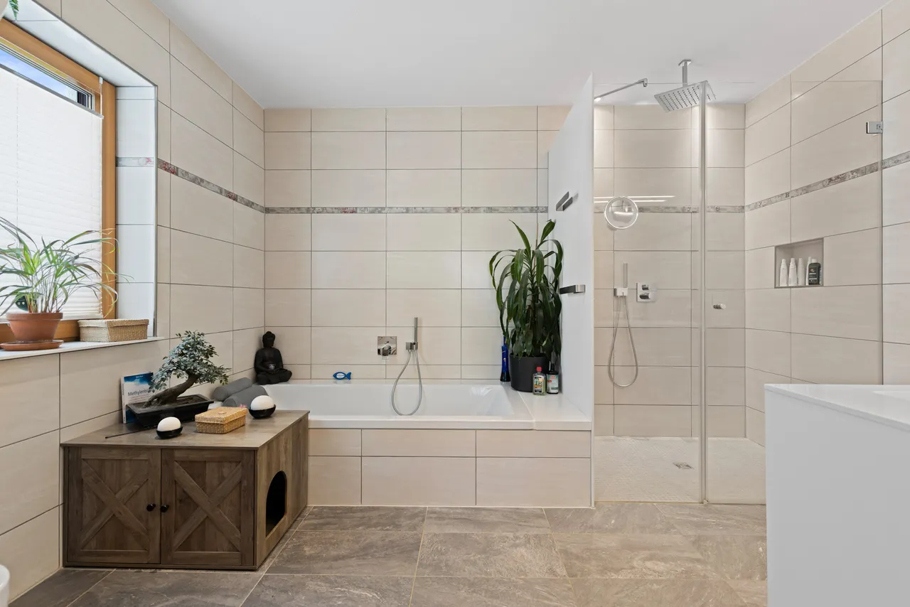 Ihre privates Badezimmer im Erdgeschoss: Das großzügige Master-Badezimmer mit Tageslicht verwöhnt Sie mit einer großen, begehbaren Dusche, einer Badewanne sowie einem eleganten Doppelwaschtisch und WC.