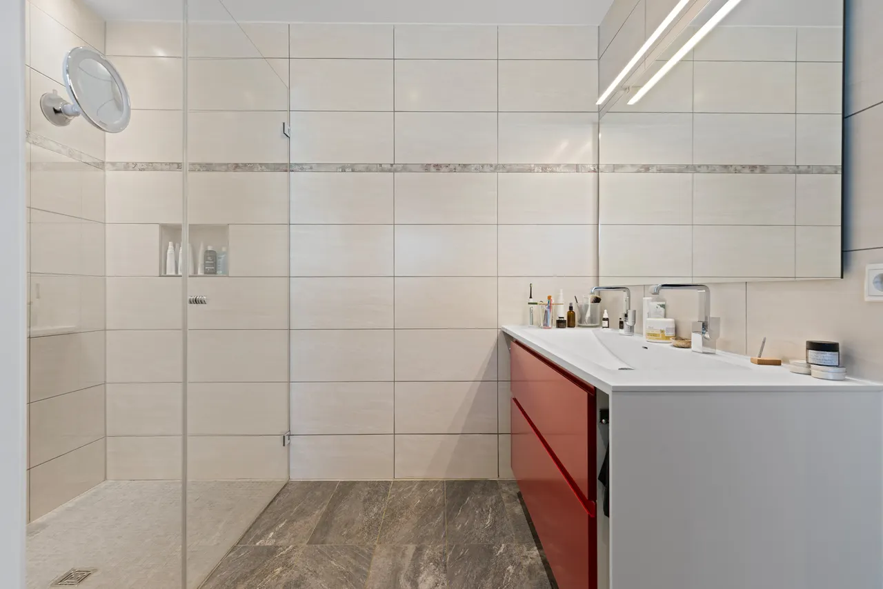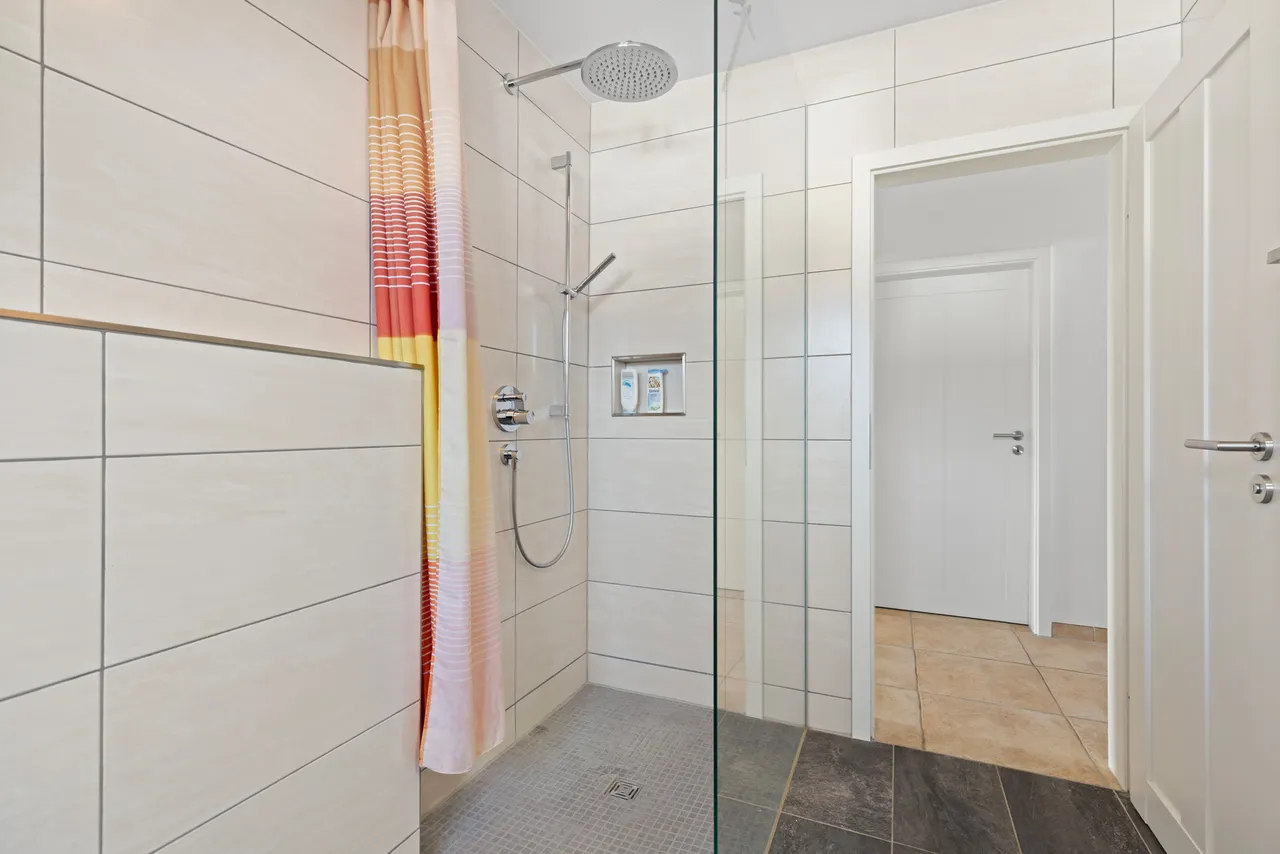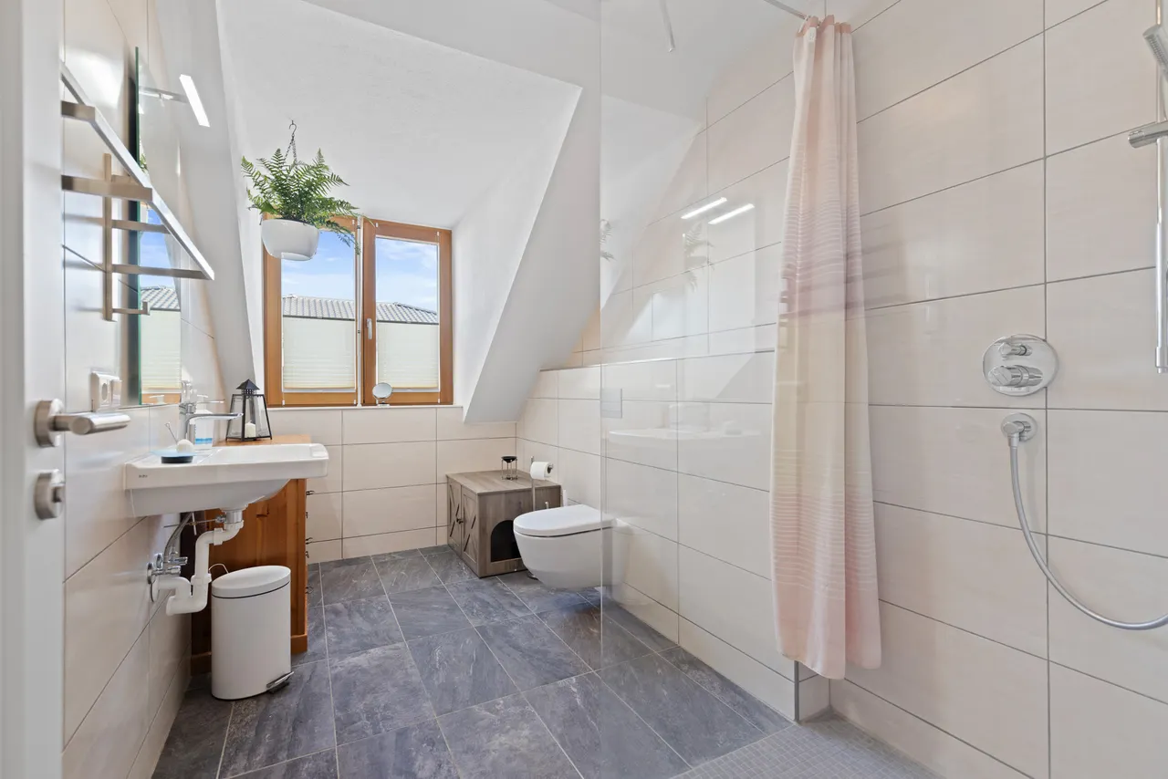 Zweites Tageslicht-Bad im Dachgeschoss: Auch das obere Stockwerk verfügt über ein voll ausgestattetes Badezimmer mit bodengleicher Dusche, Waschbecken und WC.