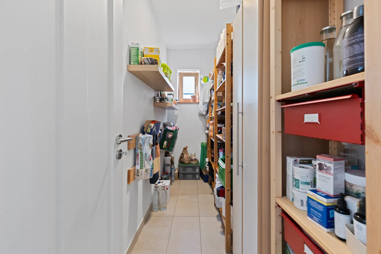 Erdgeschoss (Master-Suite): Wohnen auf einer Ebene! Hier finden Sie das großzügige Eltern-Schlafzimmer mit stilvoller Ankleide und einem direkt angrenzenden Badezimmer. Ein separates Gäste-WC, ein Hauswirtschaftsraum und eine Speisekammer ergänzen das Raumangebot im Erdgeschoss perfekt.