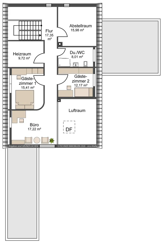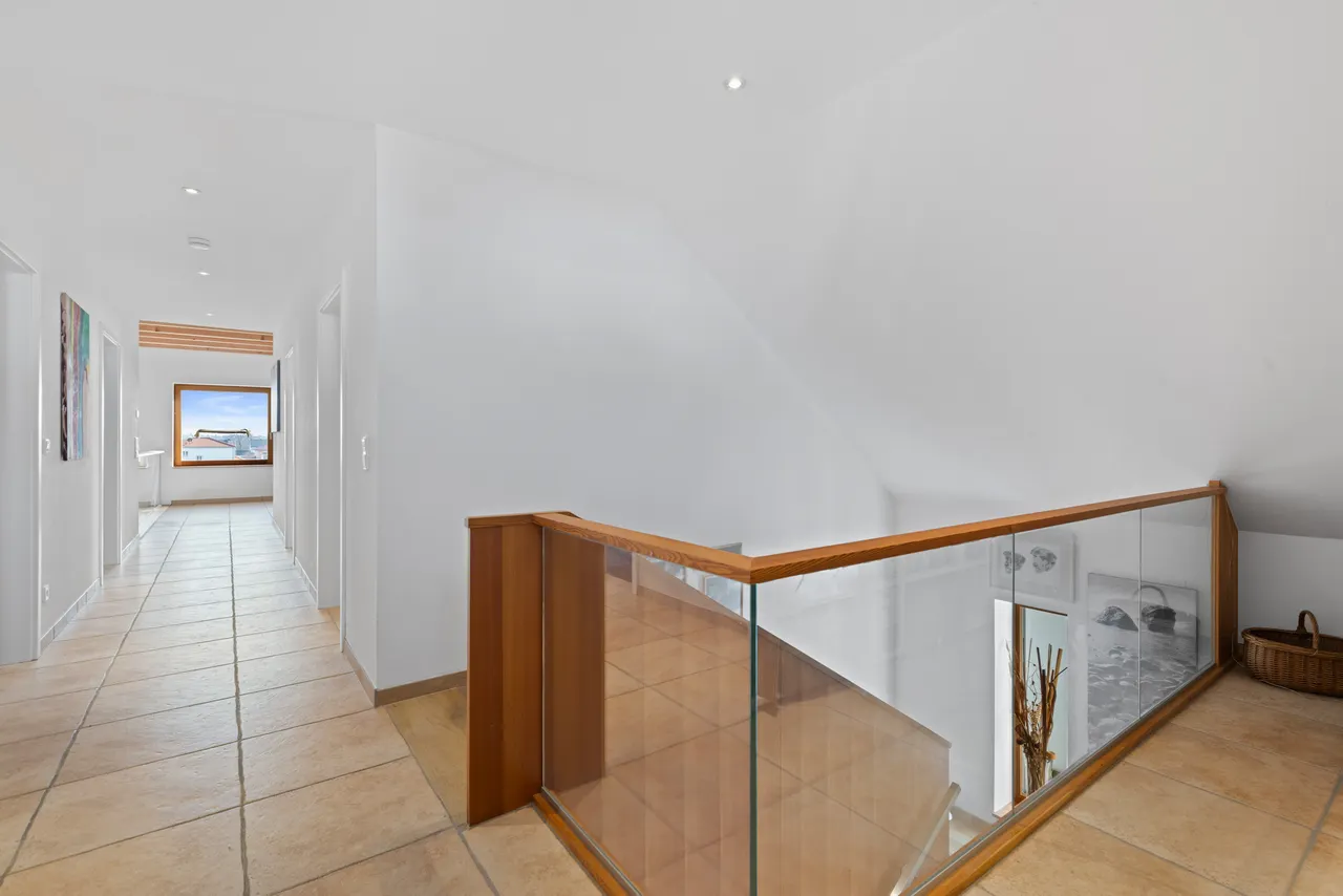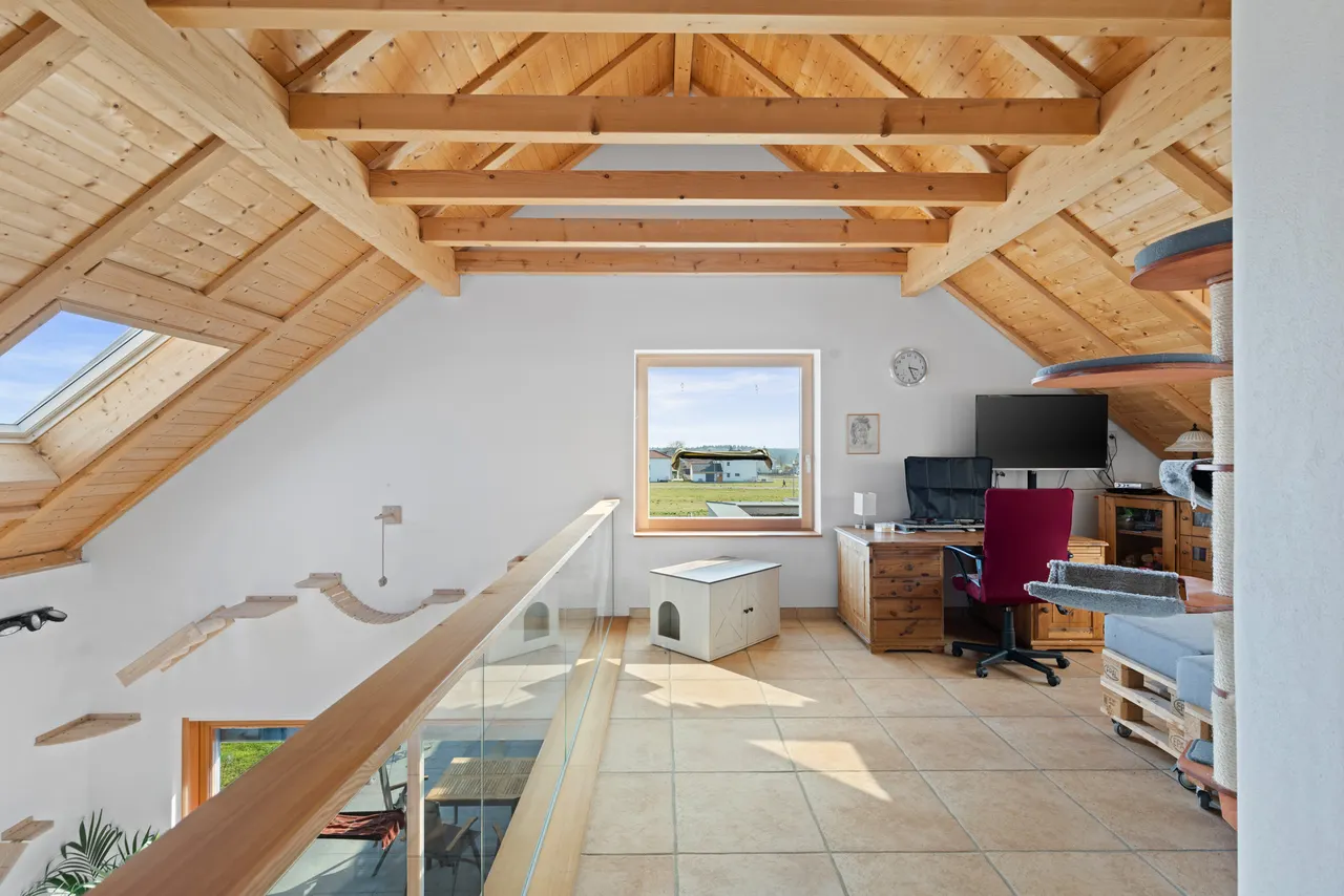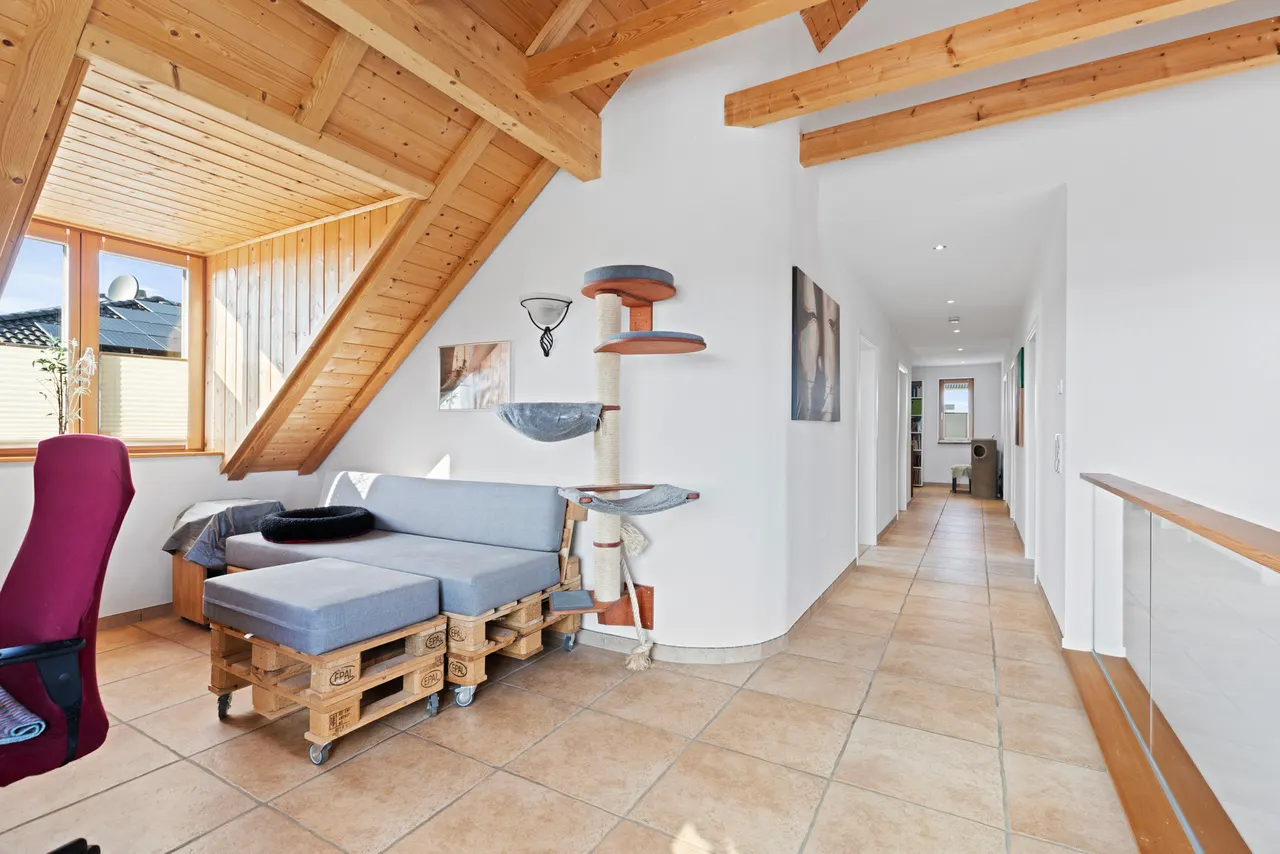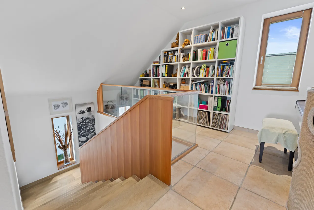 Dachgeschoss (Kinder/Gäste): Im Dachgeschoss befinden sich zwei weitere helle und gemütliche Schlafzimmer – ideal als Kinder- oder Gästezimmer. Ein eigenes, modernes Duschbad auf dieser Etage sorgt für kurze Wege und entspannte Morgenroutinen. Die Galerie eignet sich sehr gut als gemütliche Leseecke, Bibliothek oder Homeoffice.