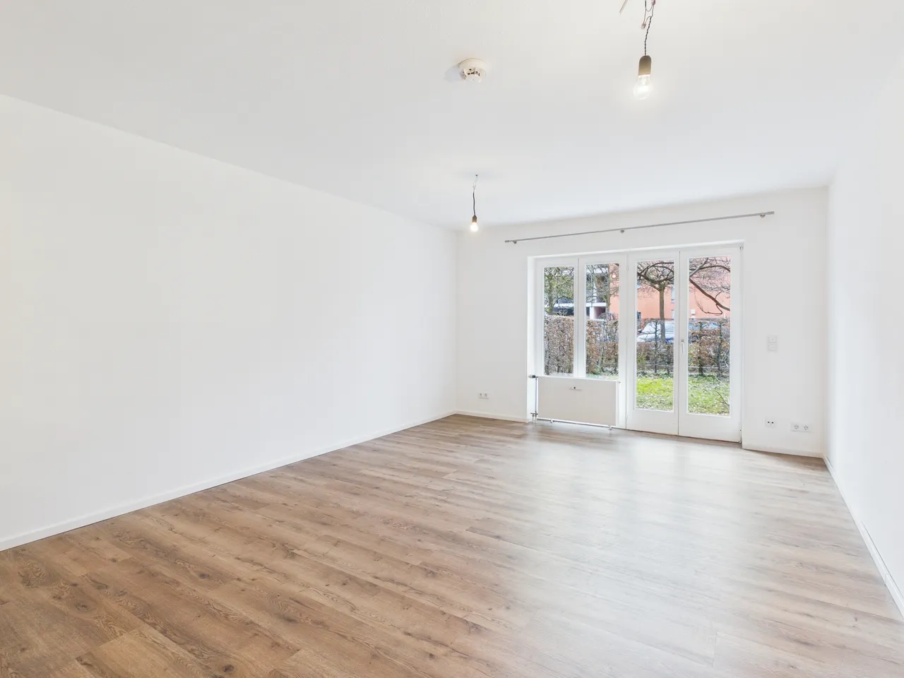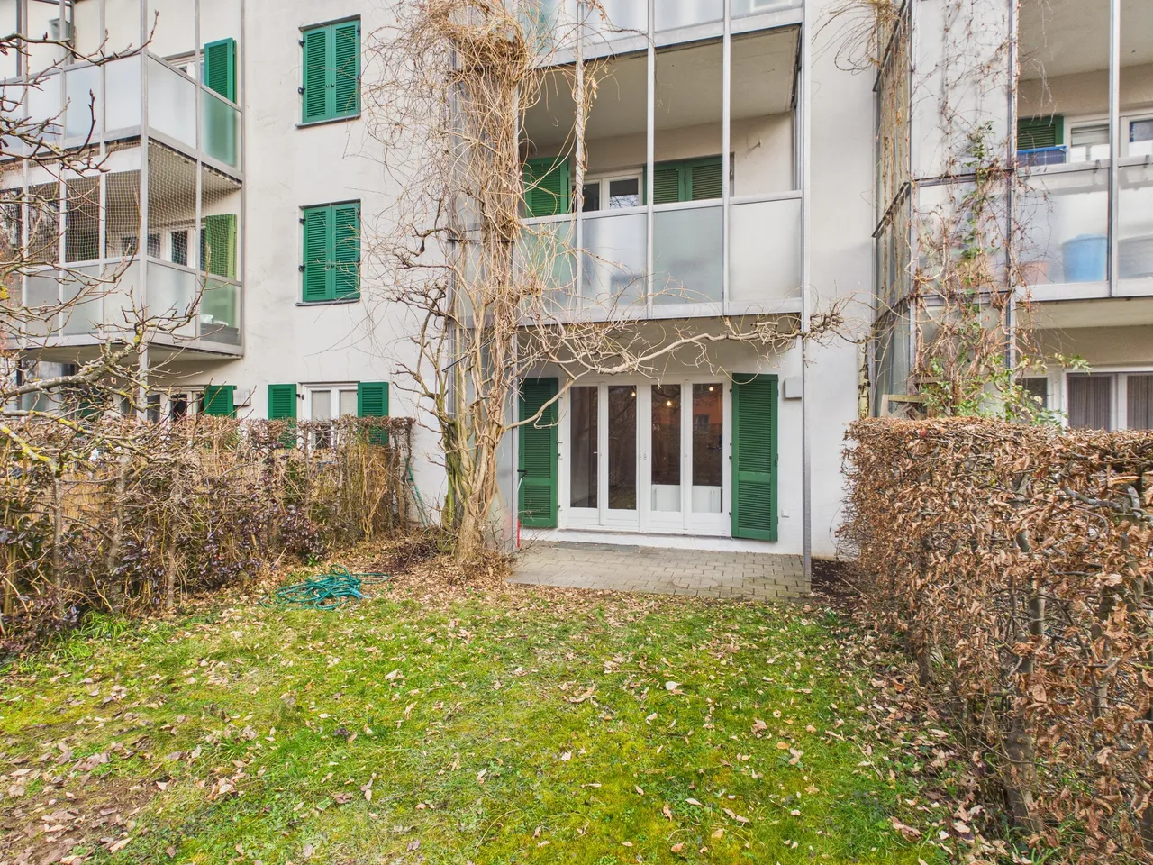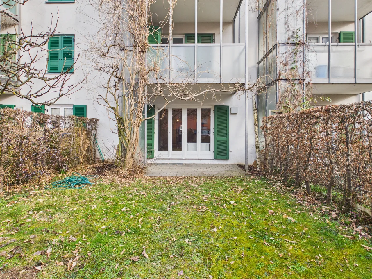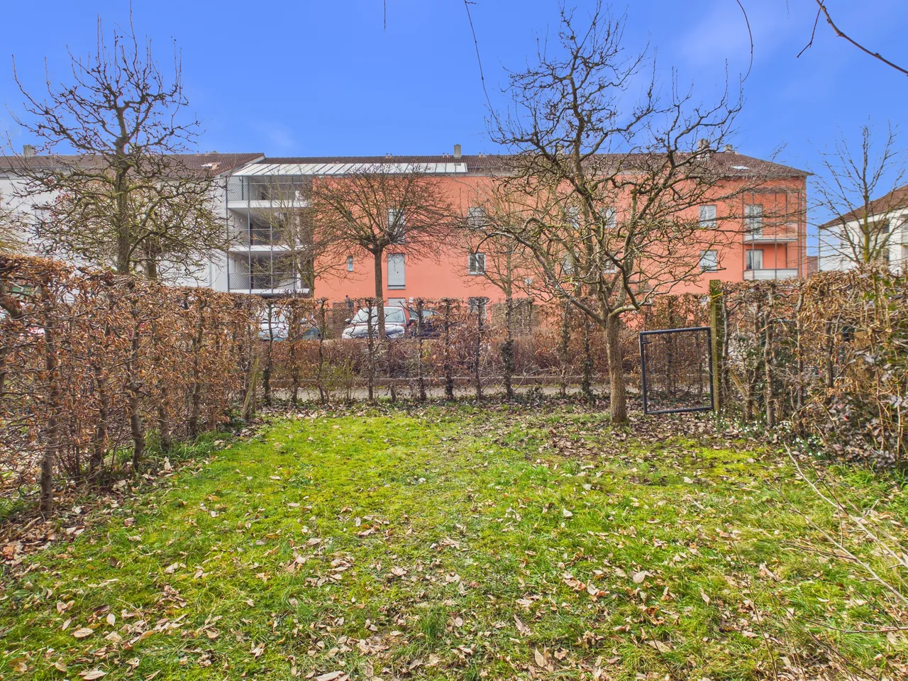 Innerhalb des Mehrfamilienhauses befindet sich die Wohnung im Erdgeschoss - das Wohnzimmer und der Garten sind nach Westen ausgerichtet, das Schlafzimmer nach Osten.