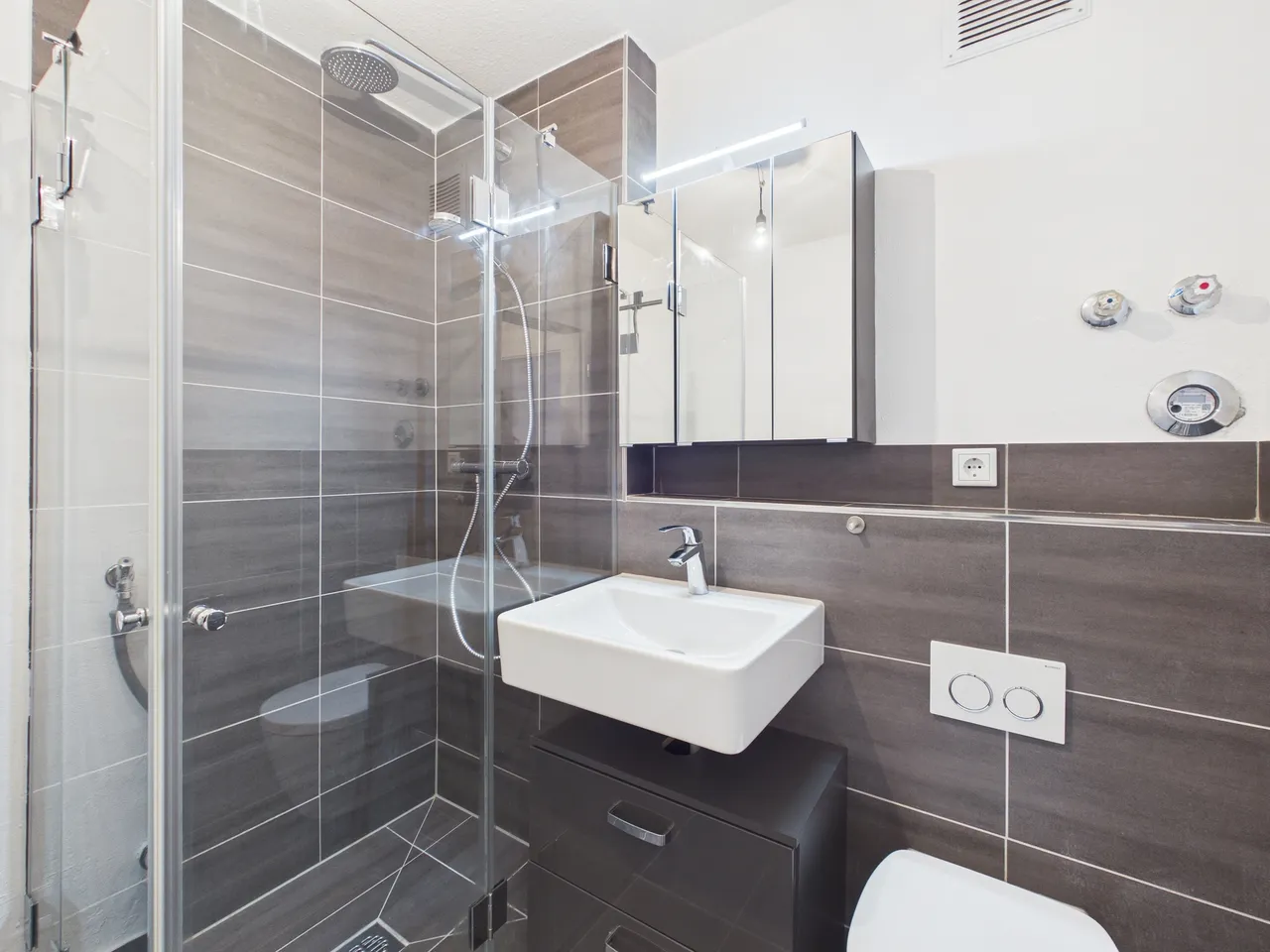 + Bad: Das Badezimmer ist innenliegend mit Entlüftung, ein Fenster ist nicht vorhanden. Es befindet sich eine bodengleiche Dusche, ein Waschbecken und ein WC.