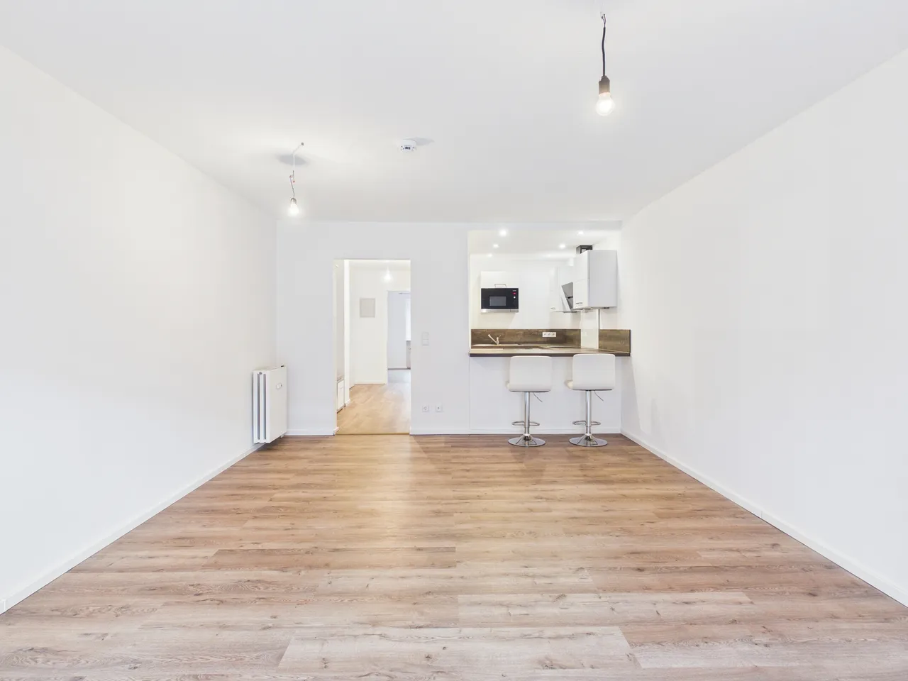+ Bodenbeläge: Im Wohn- und Schlafbereich ist Vinylboden in Eiche Holzoptik verlegt. Das Bad ist dunkel gefliest.