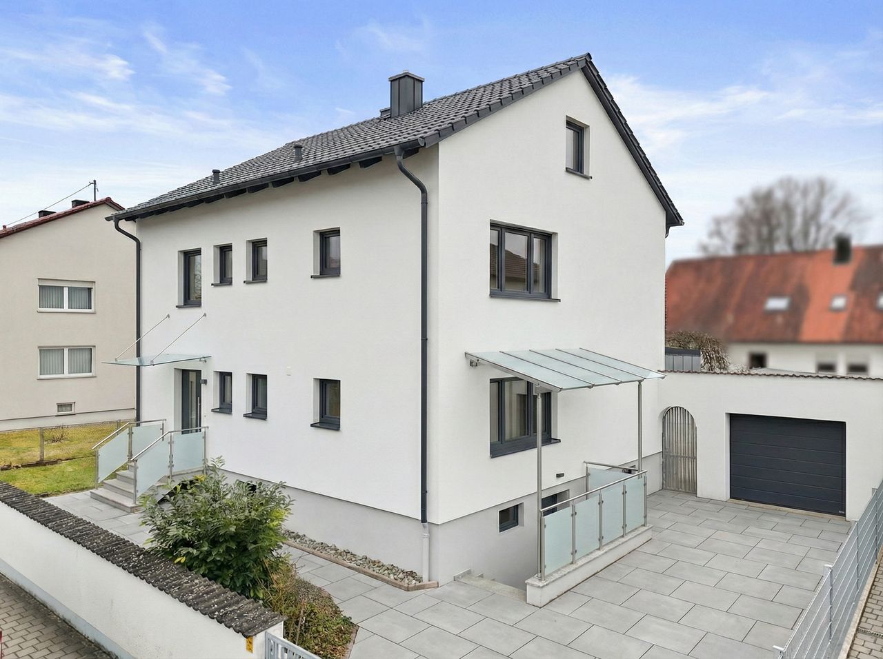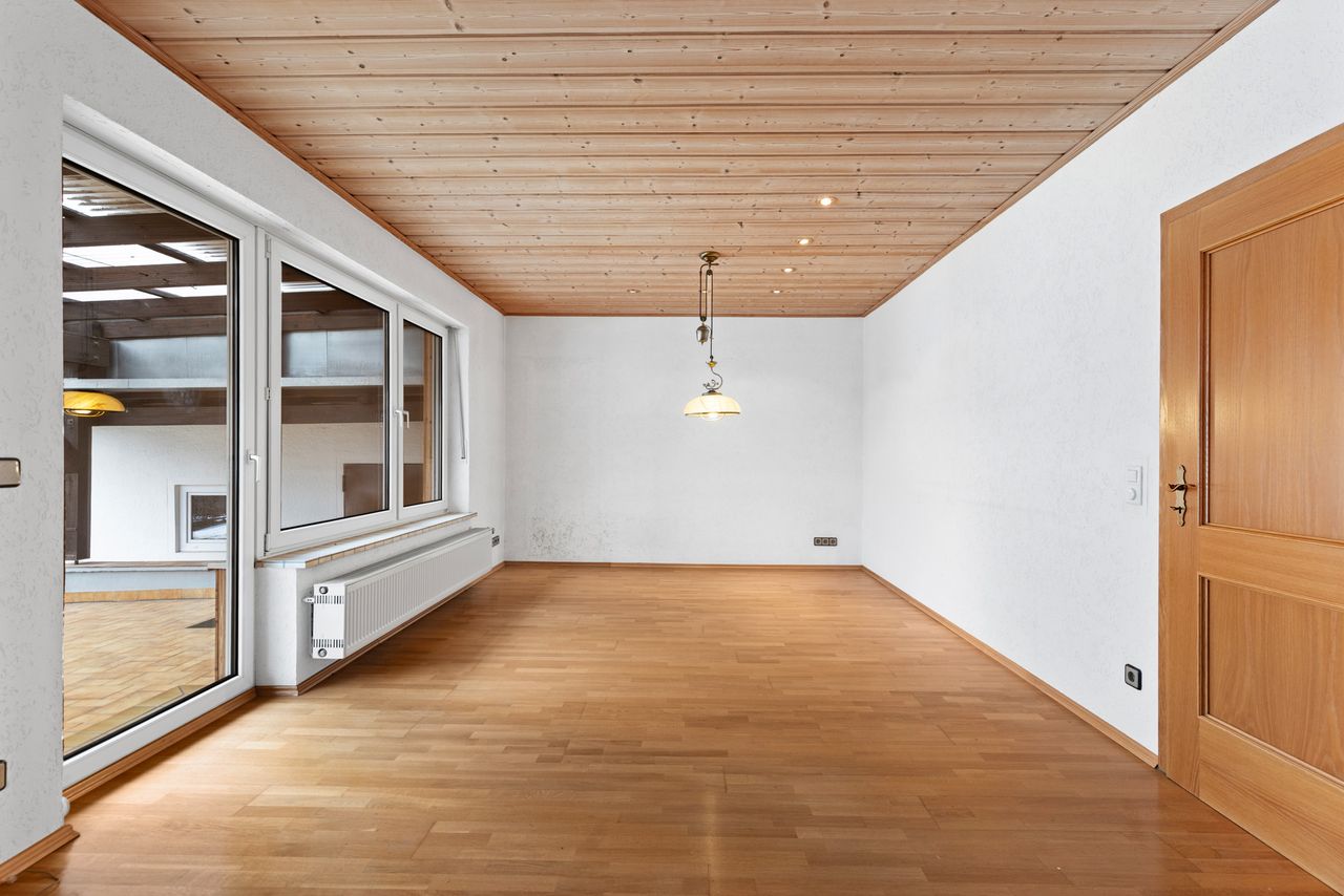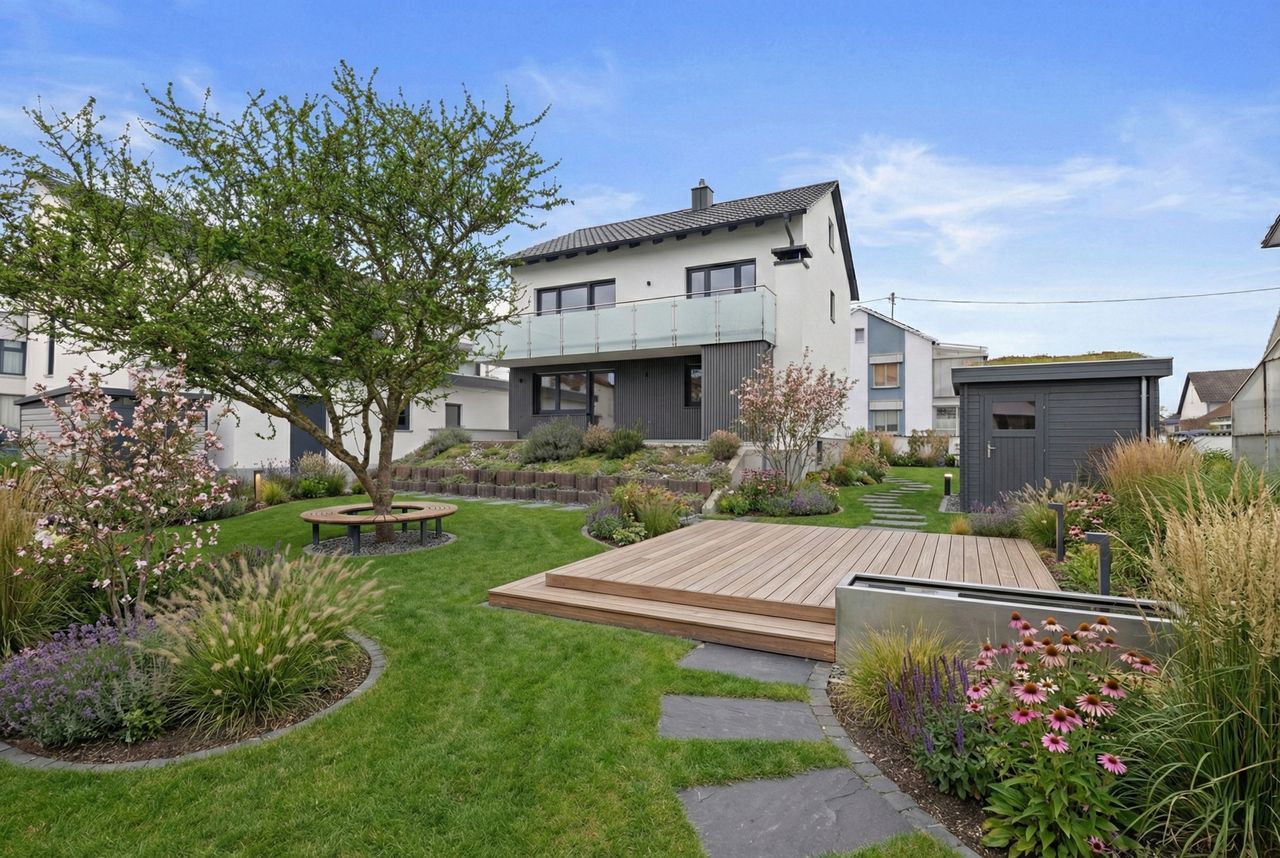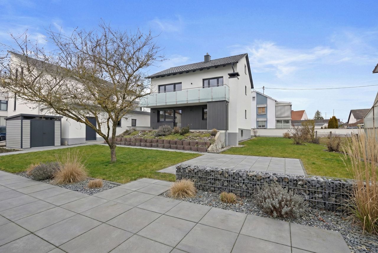 Besonders einladend ist die große und überdachte Terrasse in Südausrichtung sowie der davor befindliche Gartenanteil. Im ersten Obergeschoss steht ein großer Balkon zur Verfügung - ebenfalls in den sonnigen Süden ausgerichtet.