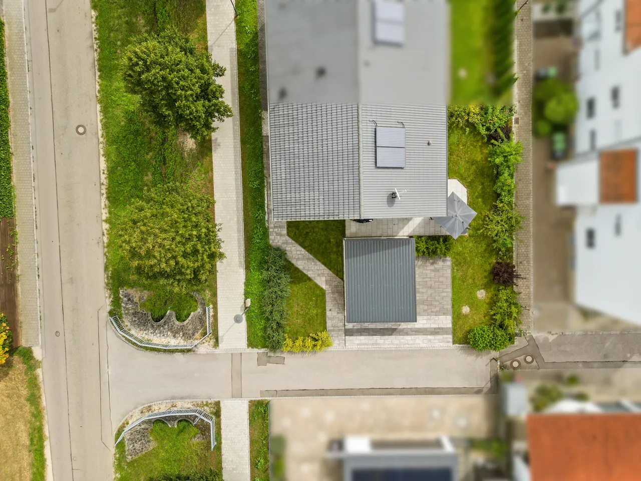 Innerhalb des Grundstücks befindet sich der Hauseingang auf der Nordseite, der Garten ist nach Süden ausgerichtet, die Garage und der Stellplatz sind von Westen aus erreichbar. Die Ausrichtung der Immobilie erfolgt in den bevorzugten Südwesten.