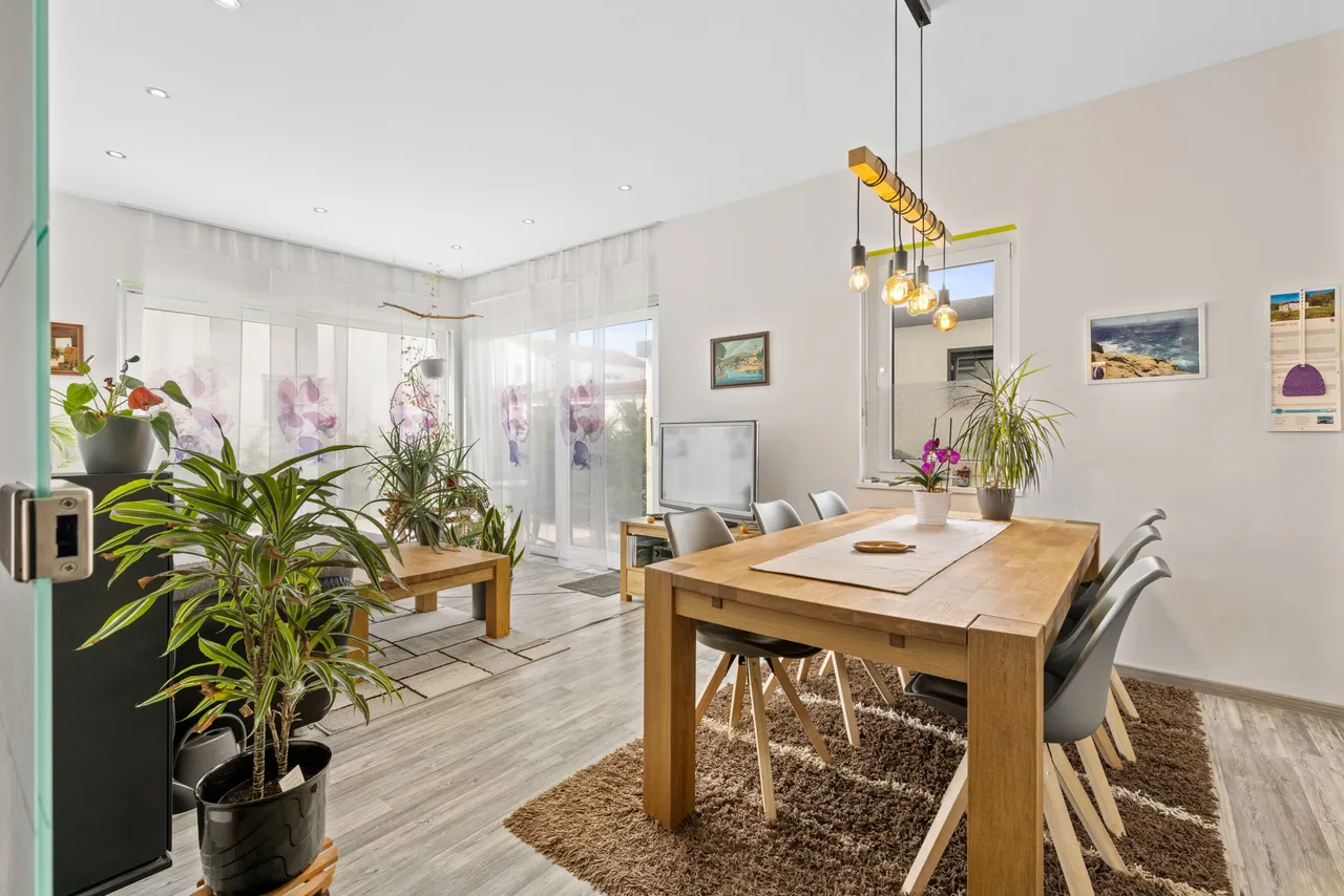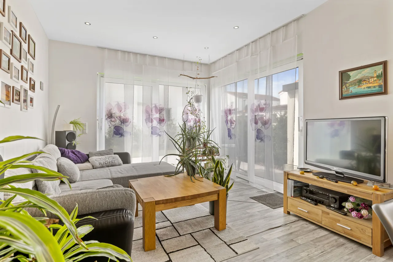 + Die Innentüren sind überwiegend hell in Holz-Dekor beschichtet, das Wohnzimmer verfügt über eine Glas-Doppeltüre.