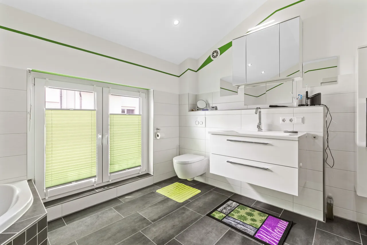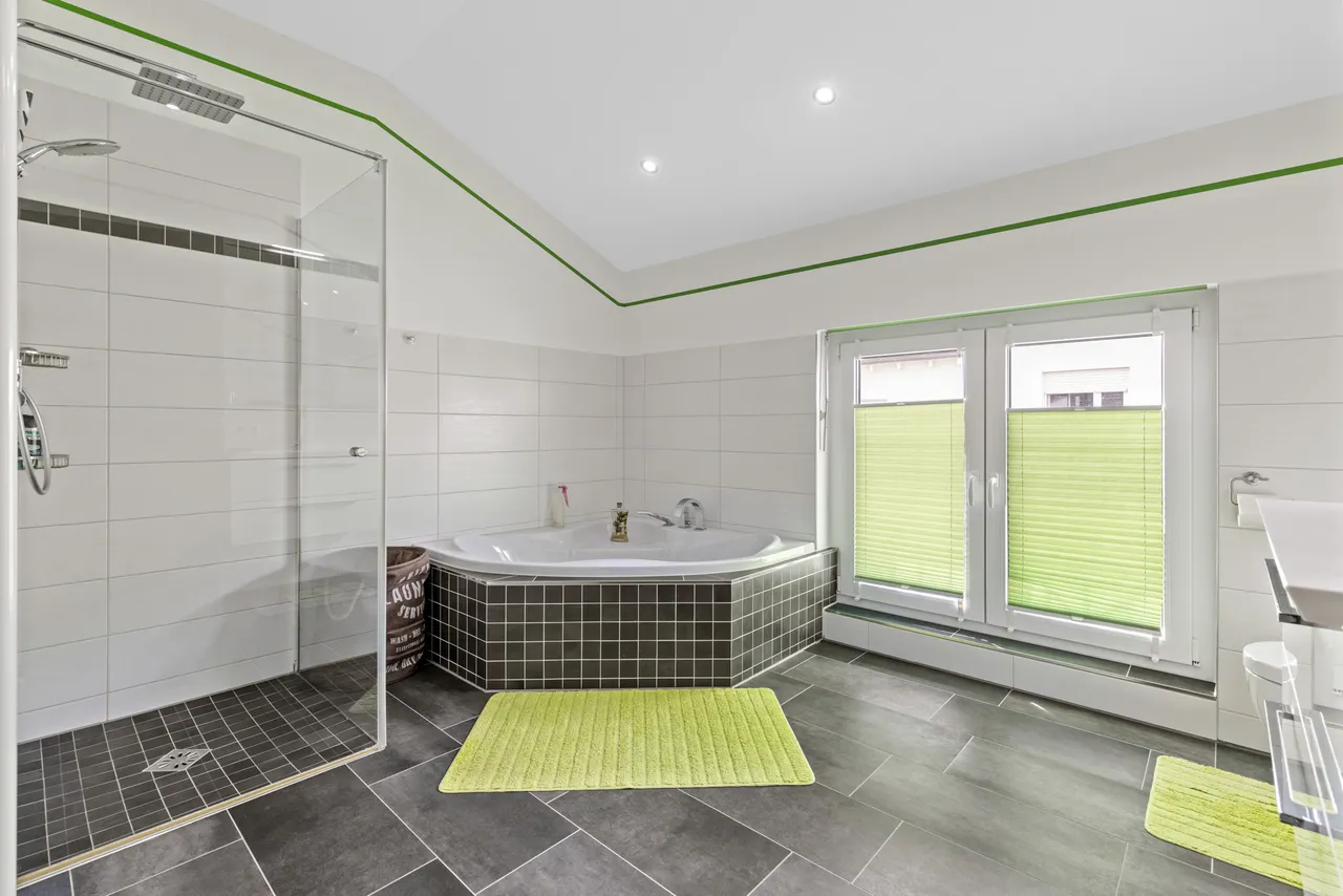 + Das Badezimmer verfügt über eine Eckbadewanne, eine bodengleiche Dusche, ein WC und einen Waschtisch.