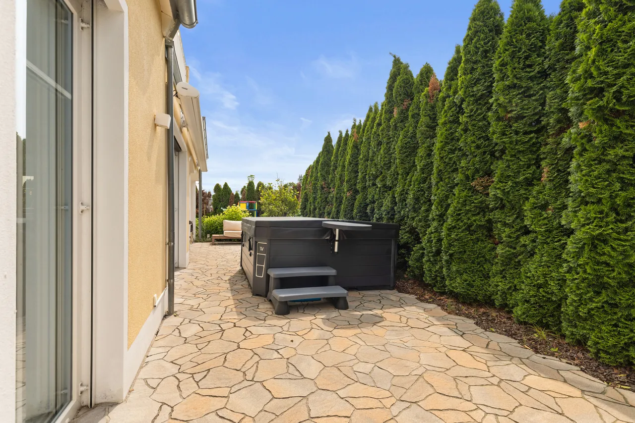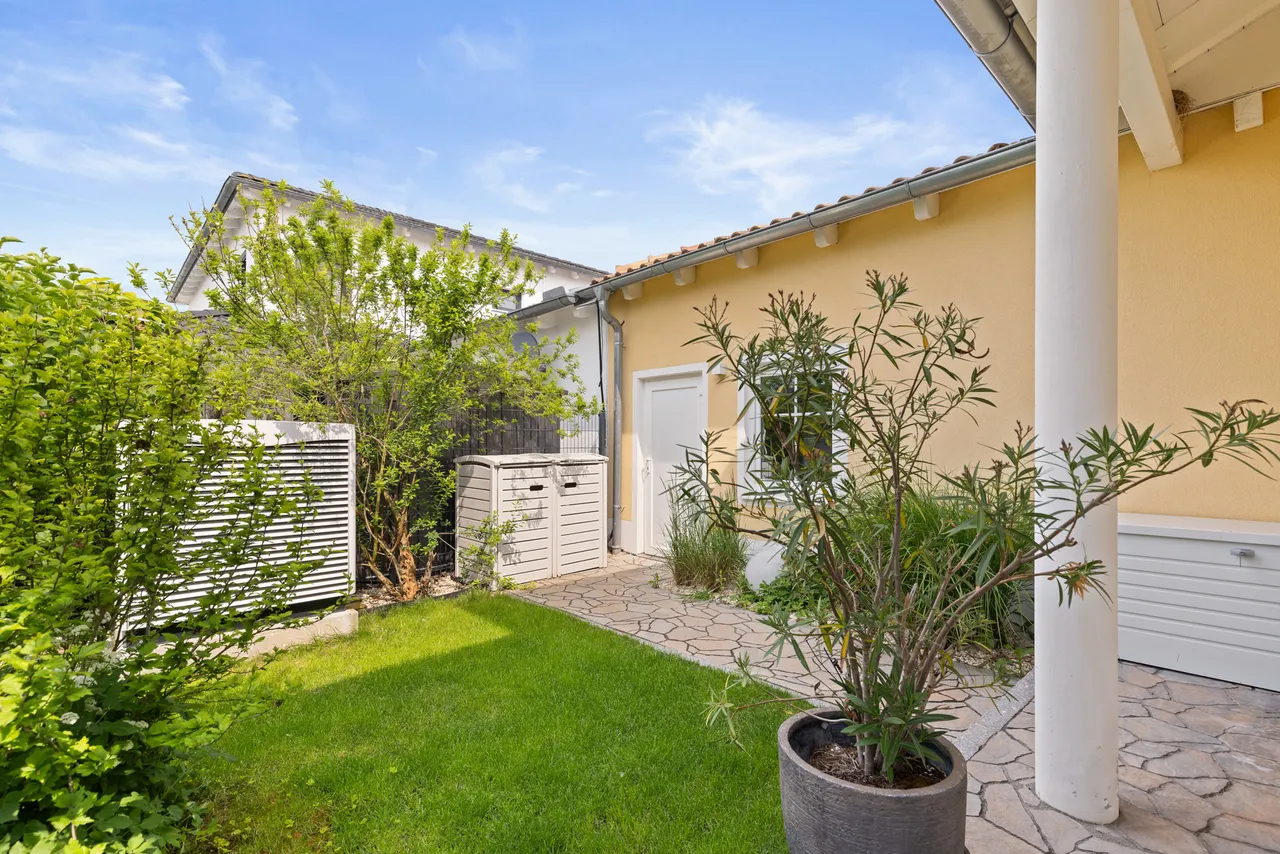 Der Garten wurde liebevoll angelegt - die Beete um die Grundstücksgrenze sind attraktiv bepflanzt. Viel Grün und gleichzeitig Privatsphäre sind gegeben. Vereinzelte Thujen sind dieses Jahr leider abgestorben - ein Austausch sorgt wieder für eine geschlossene grüne Hecke. Eine Zisterne ist vorhanden, diese wird aber derzeit nicht genutzt. Der Hauptbereich der Terrasse befindet sich im Süden - der Verlauf erstreckt sich um das gesamte Gebäude.