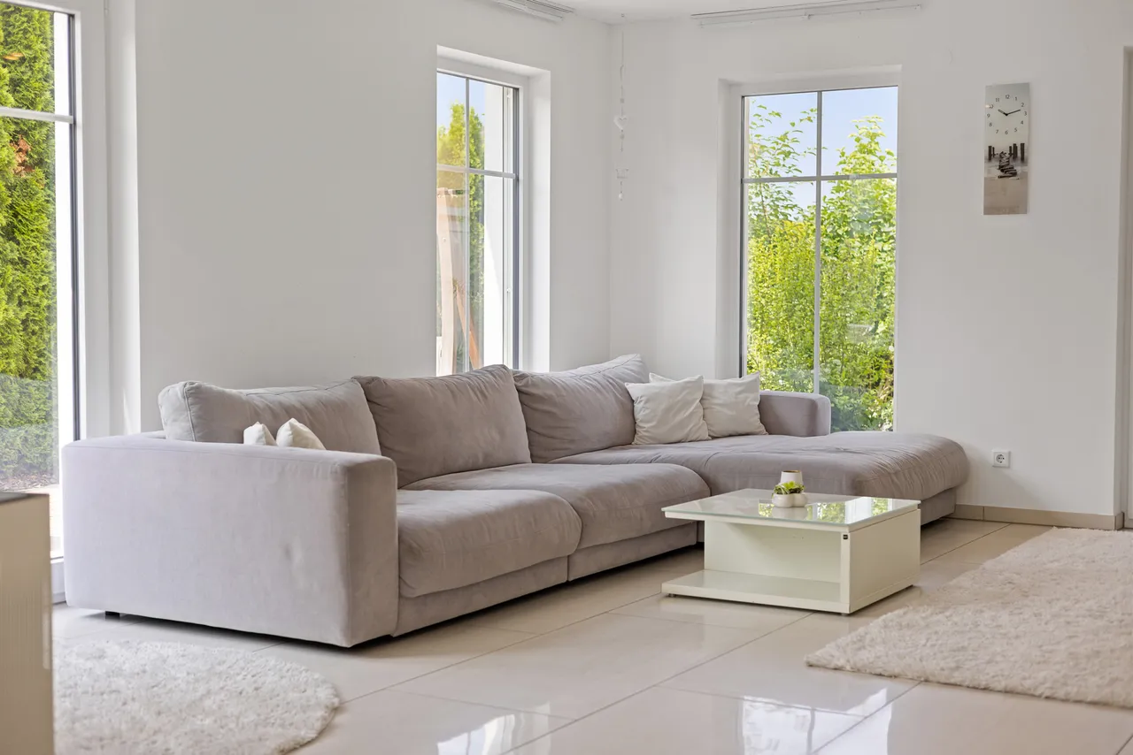 + Im Erdgeschoss befinden sich helle italienische Feinsteinzeug-Fliesen im Großformat (60 x 120cm).