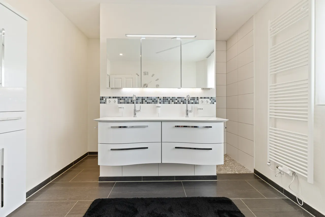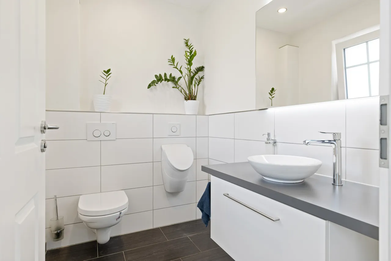 Das Badezimmer im Obergeschoss verfügt über ein Fenster, eine Eckbadewanne, eine begehbare Dusche, ein WC und einen Doppelwaschtisch. Besonders praktisch ist ein Wäscheabwurfschacht in den darunterliegenden Hauswirtschaftsraum. Das Gäste-WC im Erdgeschoss ist mit einem Waschbecken und einem WC ausgestattet - ein Fenster ist auch hier vorhanden.
