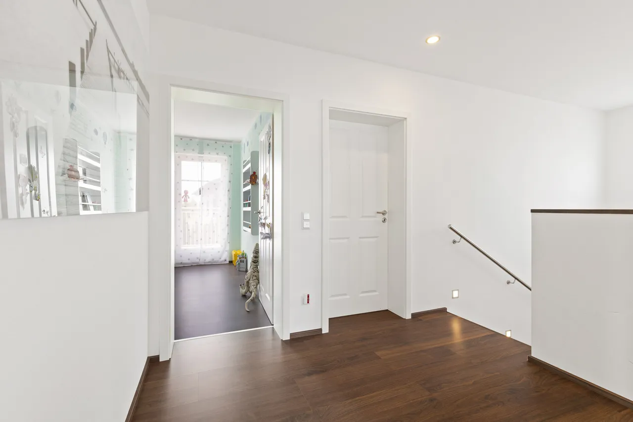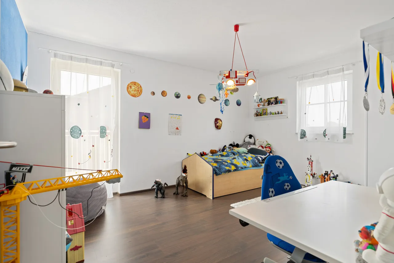 Im Obergeschoss befinden sich zwei nahezu gleich große Kinderzimmer. Beide Kinderzimmer verfügen über einen direkten Balkonzugang. Über das Elternschlafzimmer ist ein Ankleideraum erreichbar. Die Ankleide wurde als "halbes Zimmer" gezählt. Im Obergeschoss befindet sich auch das Badezimmer mit Doppelwaschtisch, begehbarer Dusche, Eckbadewanne, WC und Wäscheabwurfschacht.