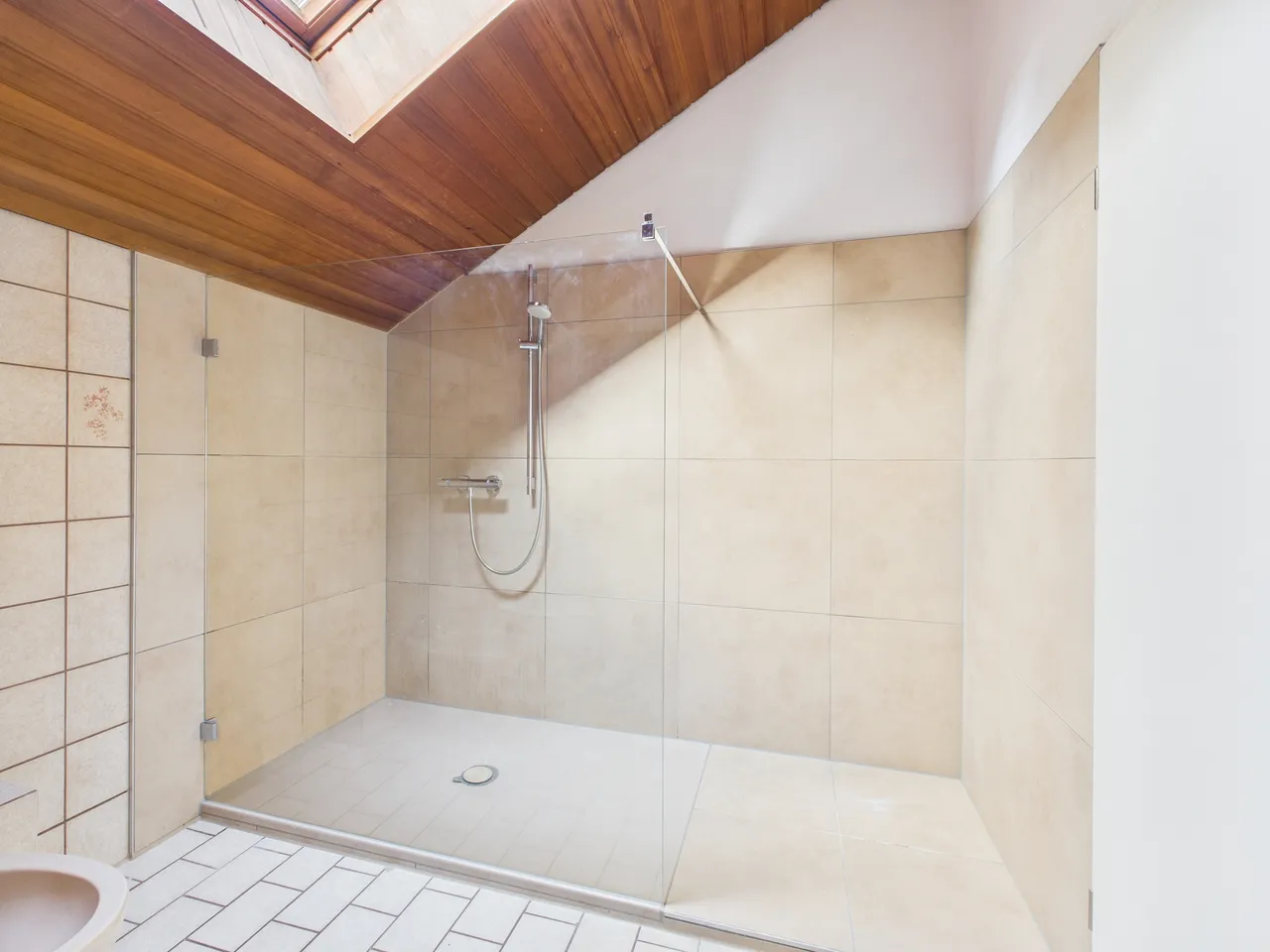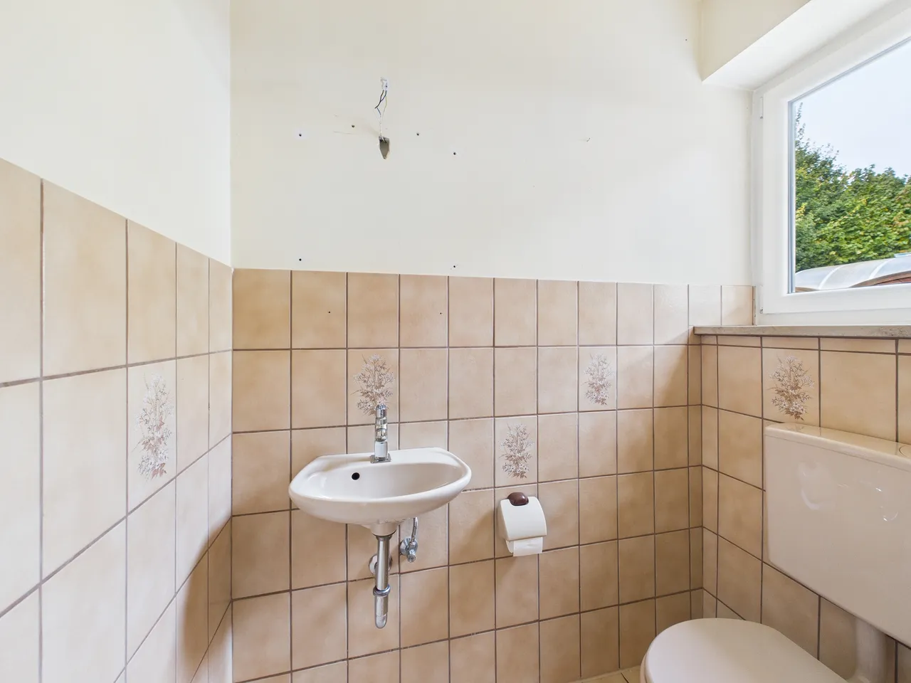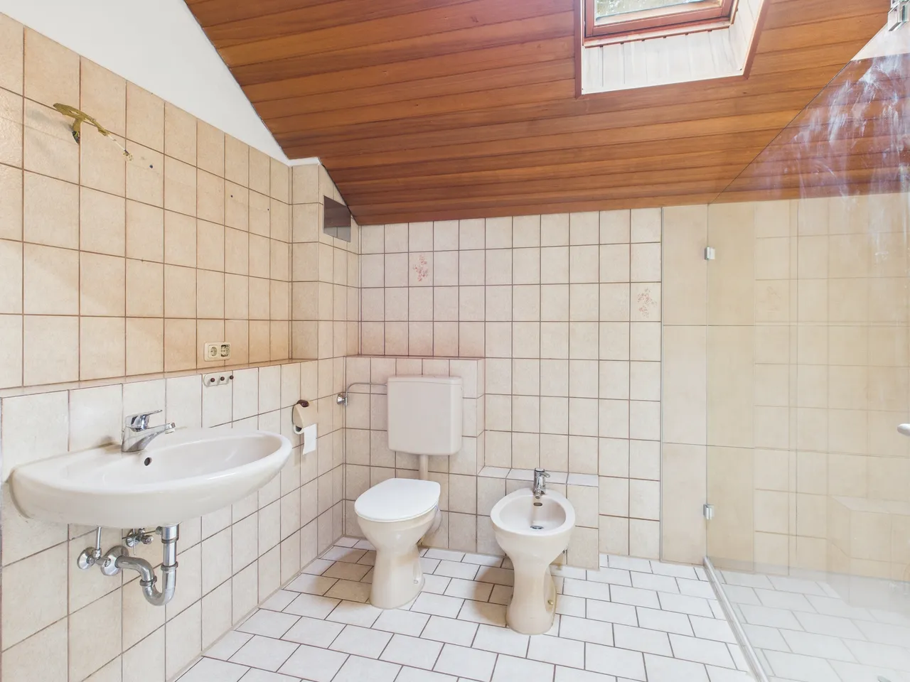 Das Gäste-WC im Erdgeschoss und das Badezimmer im Dachgeschoss wurden noch nicht erneuert. Allerdings wurde im Badezimmer eine neue, große Dusche installiert. Daneben steht ein WC, ein Bidet und ein Waschbecken zur Verfügung. Beide Sanitärbereiche verfügen über ein Fenster.