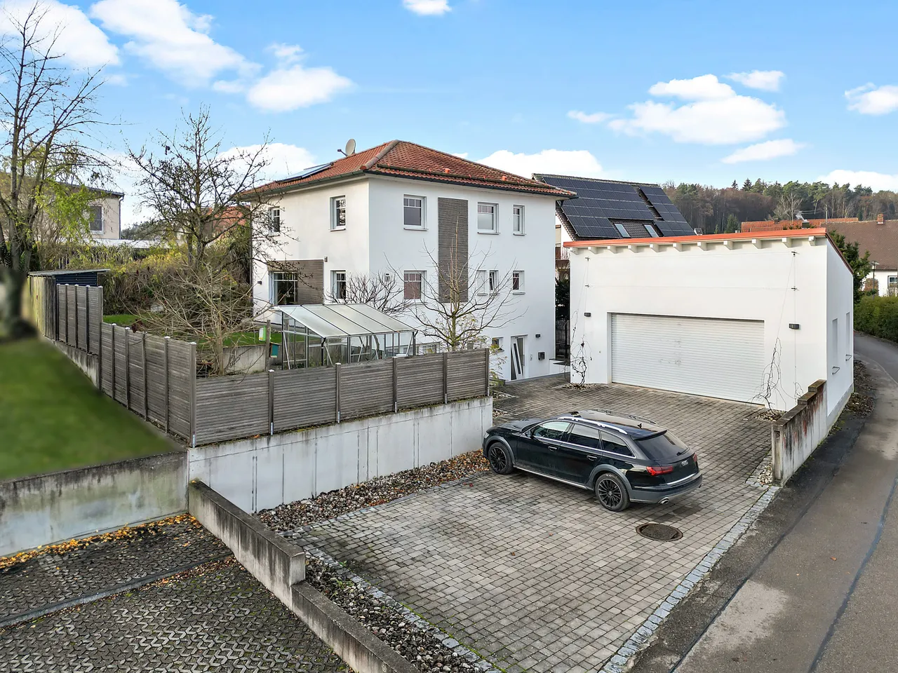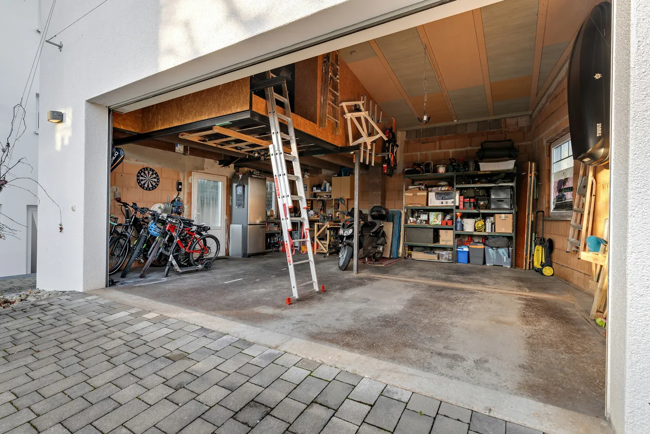 Besonders praktisch ist die gemauerte Doppelgarage! Auf circa 51,20m² bietet sich viel Platz für Fahrzeuge, Hobby und Handwerk! Daneben können auf dem eigenen Grundstück noch bequem zwei weitere Fahrzeuge im Freien geparkt werden, ohne dass die Zufahrt zur Garage blockiert ist.