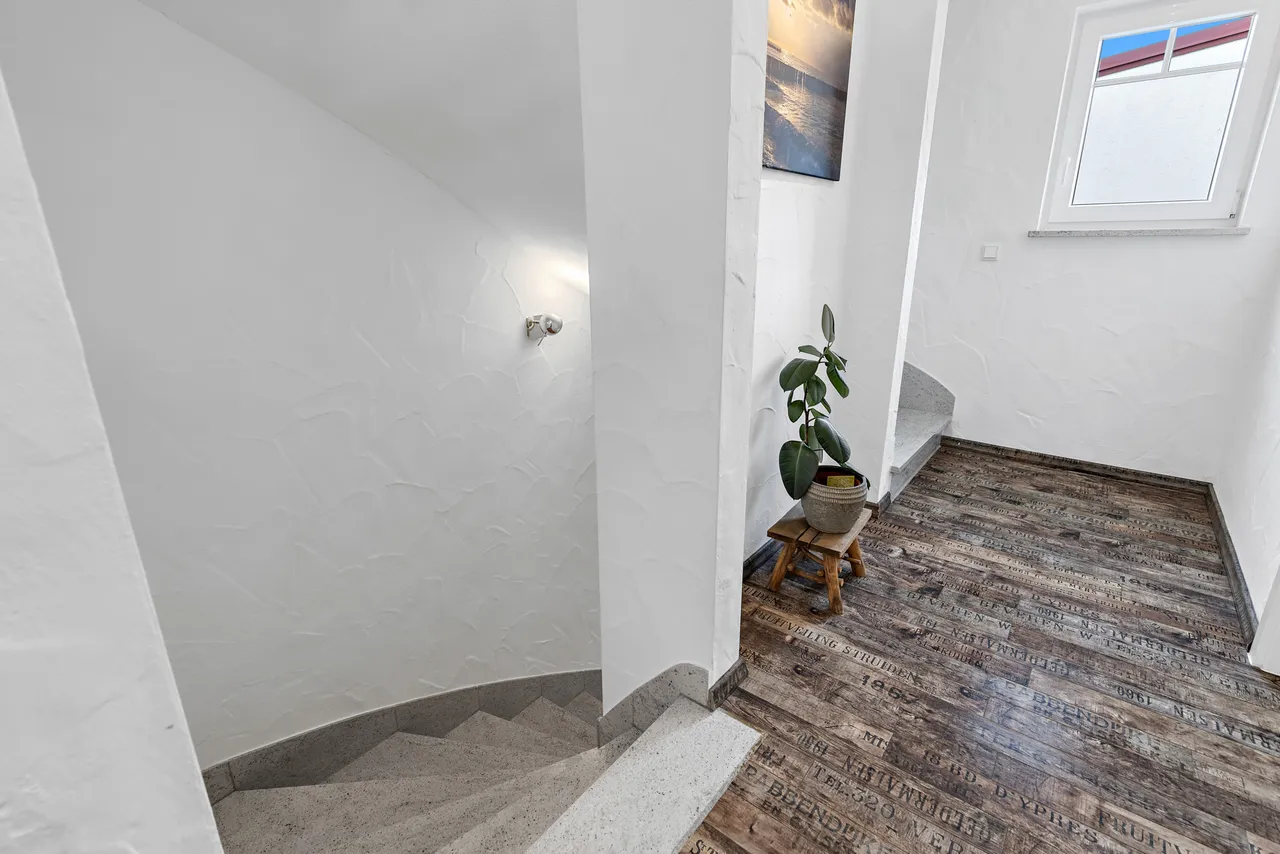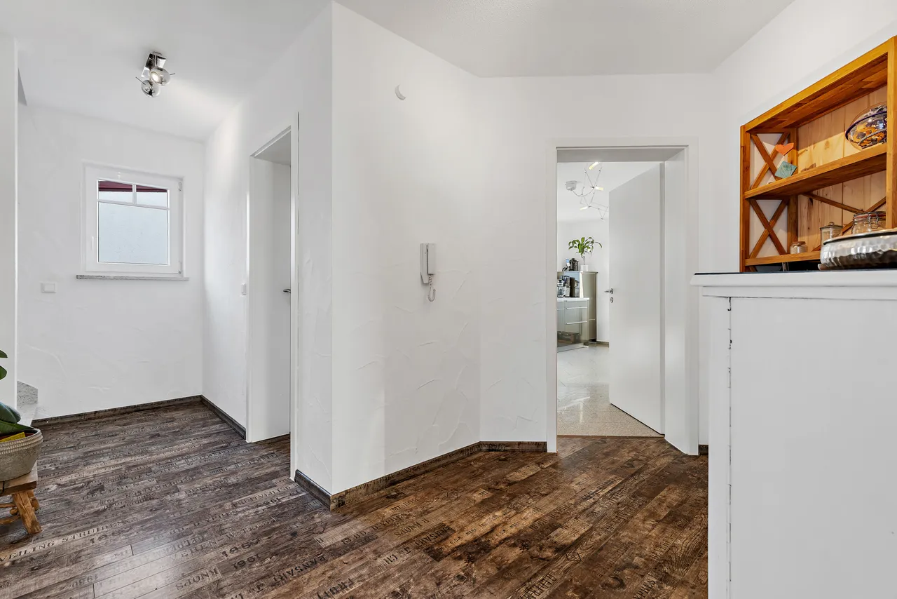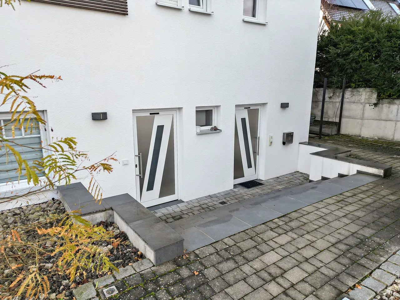 Die Immobilie verfügt über zwei Eingänge (links & rechts, siehe Foto). Über die linke Türe gelangen Sie zu einem hochwertig ausgebautem Untergeschoss (Nutzfläche), über die rechte Türe gelangen Sie in den Hauptwohnbereich der Immobilie (Wohnfläche). Die beiden Bereiche sind im Inneren verbunden und somit bequem zugänglich.
