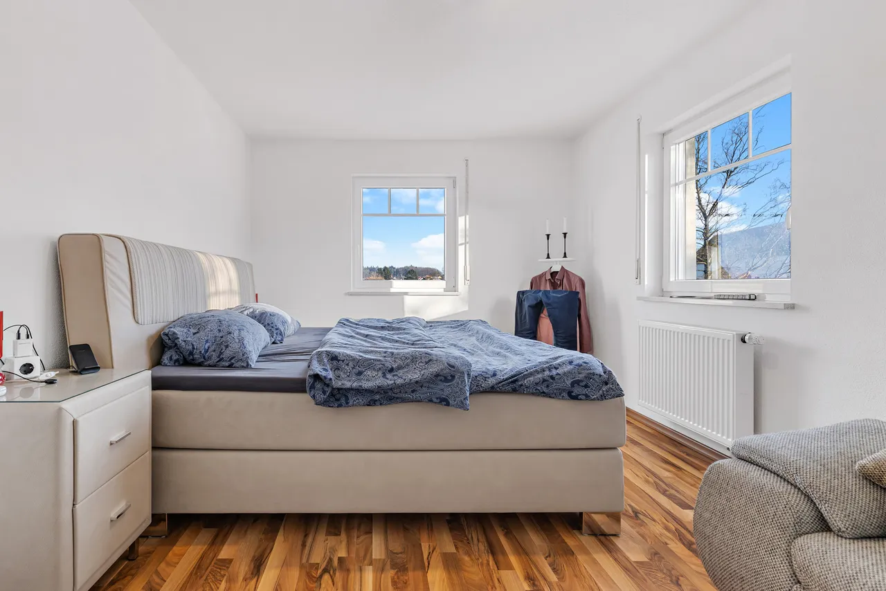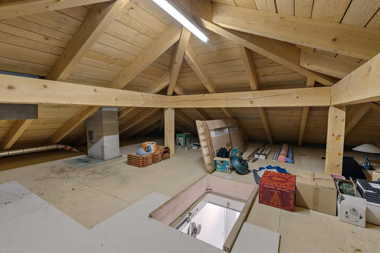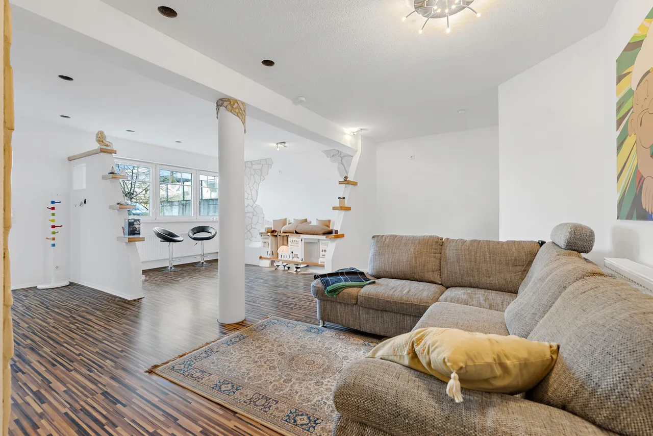 Die Immobilie verfügt über zwei Eingänge (links & rechts, siehe Foto). Über die linke Türe gelangen Sie zu einem hochwertig ausgebautem Untergeschoss (Nutzfläche), über die rechte Türe gelangen Sie in den Hauptwohnbereich der Immobilie (Wohnfläche). Die beiden Bereiche sind im Inneren verbunden und somit bequem zugänglich.